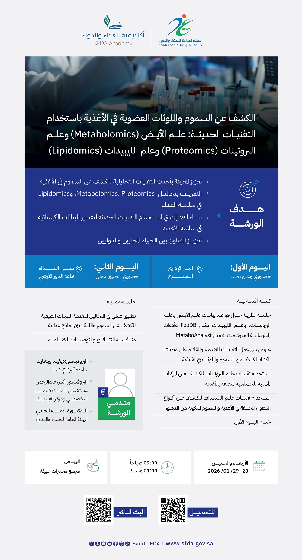 2026-01-28 - 2026-01-29 الكشف عن السموم والملوثات العضوية في الأغذية باستخدام التقنيات الحديثة 2026-01-13 - 2026-01-13 مناقشة سبل التعاون وتوحيد الجهود في مجال تدريب مسؤولي سلامة الغذاء في المنشآت الغذائية 2025-12-17 - 2025-12-17 شرح وتوضيح إجراءات الاستيراد والتصدير وحرية البيع المحاور: شرح إجراءات الاستيراد والتصدير للمنتجات الغذائية وحرية البيع. شرح وتوضيح اليات…