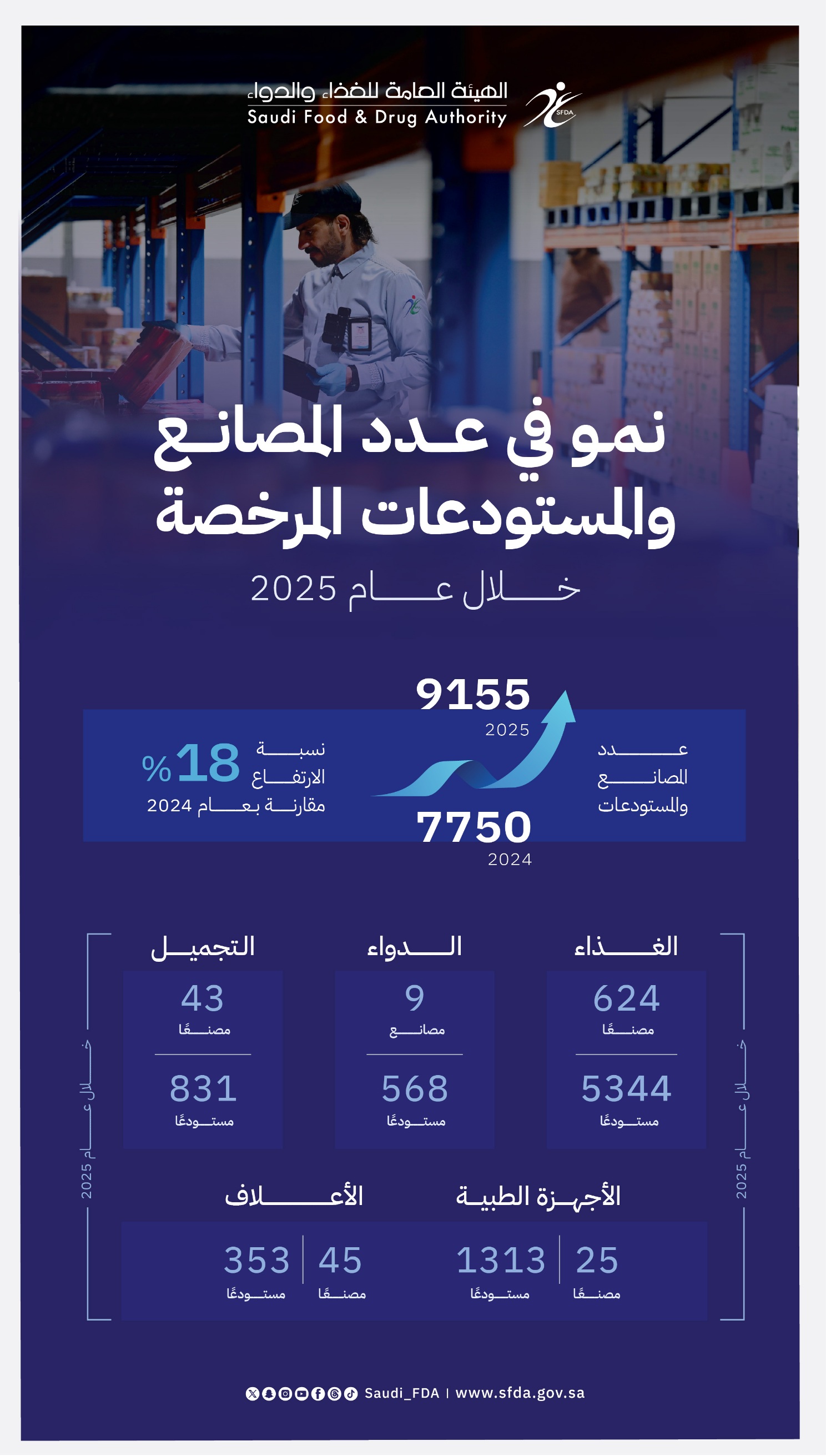 2026-01-26 الغذاء, الدواء, أجهزة طبية "الغذاء والدواء": نمو بنسبة 18% في عدد المصانع والمستودعات المرخصة خلال عام 2025