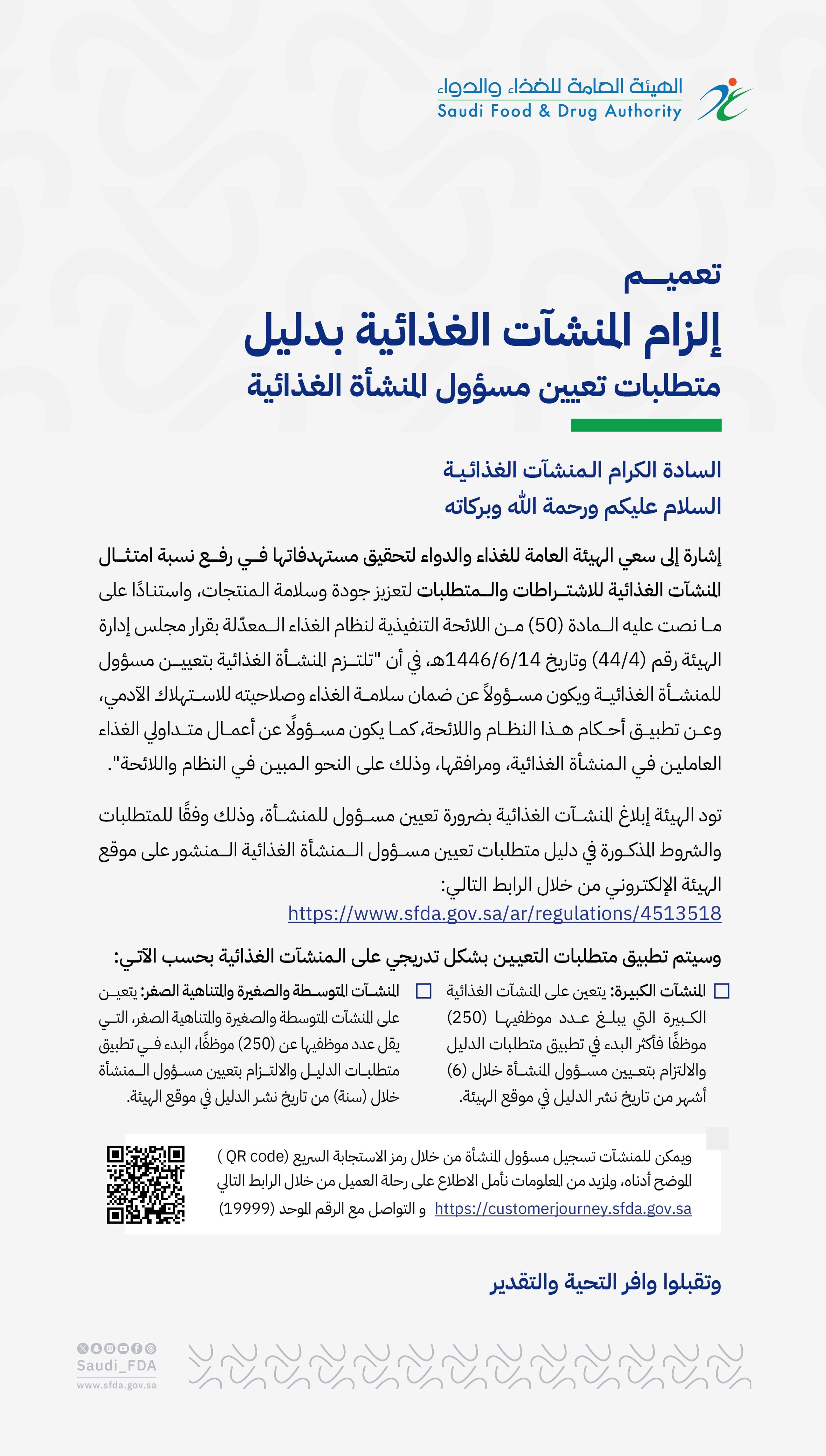 إلزام المنشآت الغذائية بدليل متطلبات تعيين مسؤول المنشأة الغذائية