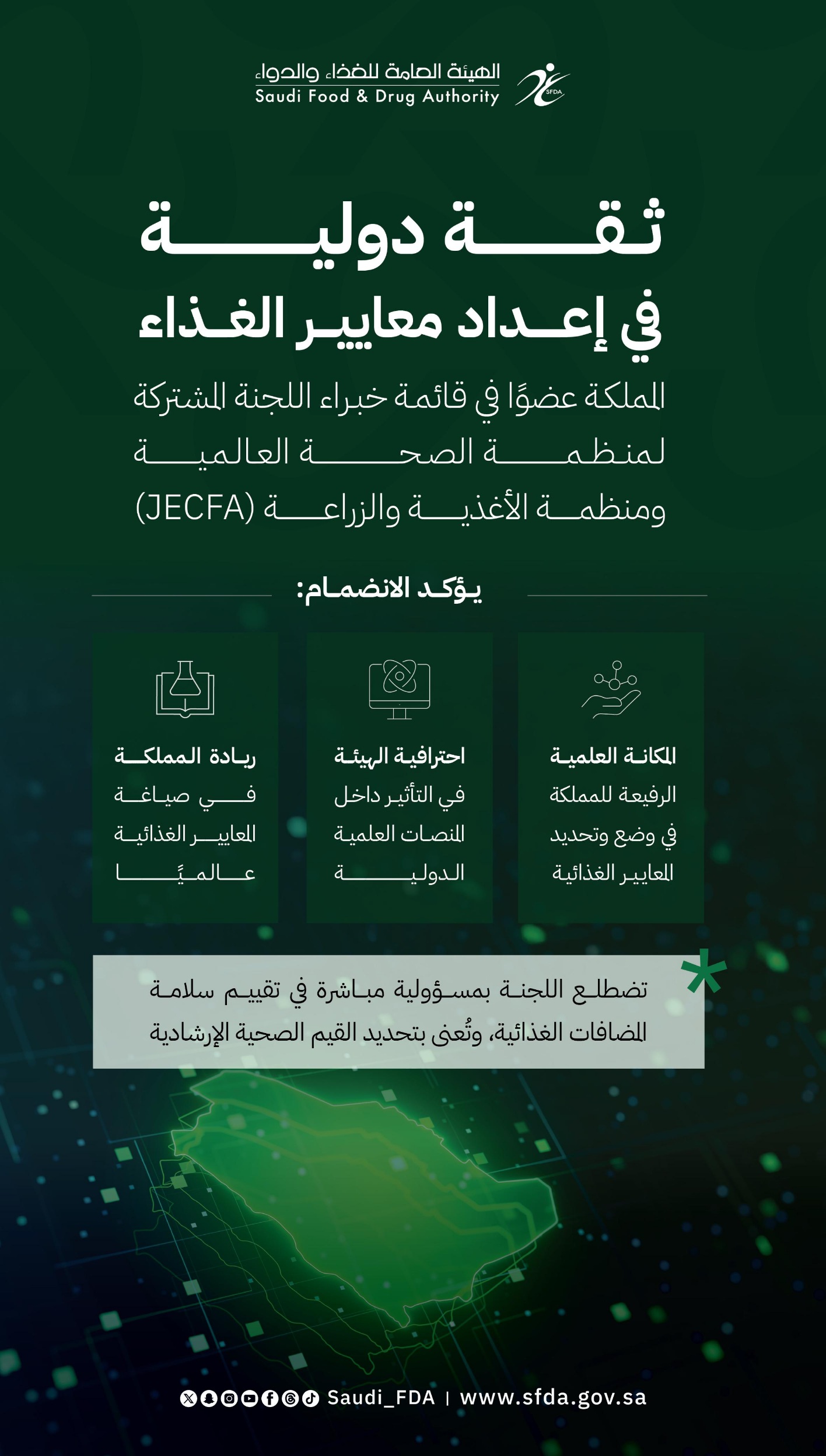 2026-01-27 الهيئة, الغذاء المملكة ممثلةً بـ "الغذاء والدواء" تنضم للجنة دولية تُحدّد معايير المواد المضافة للغذاء أعلنت اللجنة المشتركة لخبراء منظمة الصحة العالمية ومنظمة الأغذية والزراعة حول المواد المضافة في… 2026-01-25 الهيئة مركز التوعية التفاعلي في هيئة الغذاء والدواء يستقبل وفودًا من وزارتي "الحرس الوطني" و"الصناعة" استقبل مركز التوعية التفاعلي التابع للهيئة العامة للغذاء والدواء، اليوم, وفودًا لعددٍ من الجهات… 2026-01-23 الهيئة, الغذاء "الغذاء والدواء" تختتم أعمال ورشة العمل الدولية لهيئة الدستور الغذائي اُختتمت في العاصمة الرياض أعمال ورشة العمل التي نظمتها الهيئة العامة للغذاء والدواء في مقرها الرئيس…