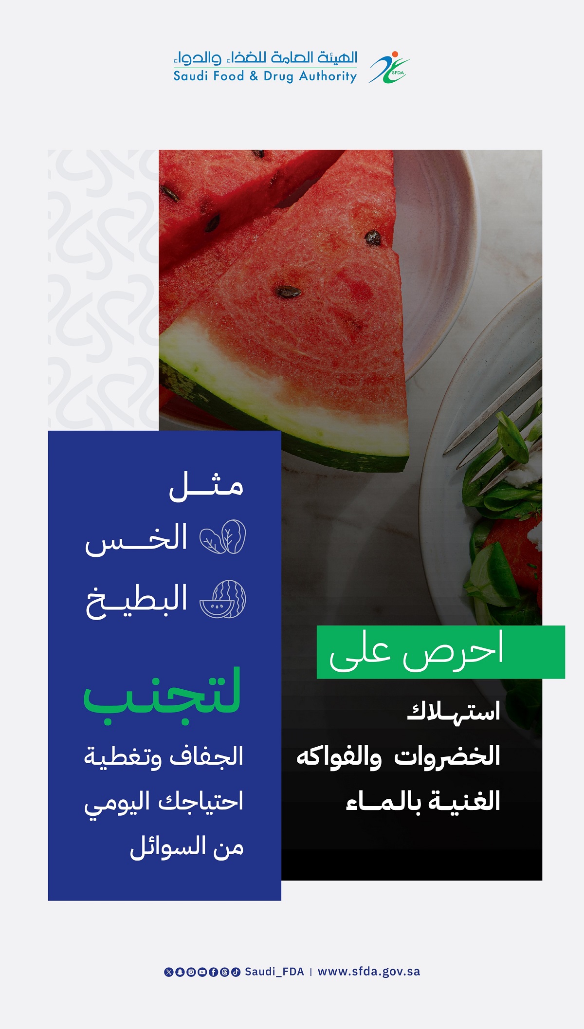 أكدت الهيئة العامة للغذاء والدواء أهمية الحرص على استهلاك الخضروات والفواكه الغنية بالماء مثل (الخس، والبطيخ) لتجنب الجفاف خلال فترة الصيف وتغطية الاحتياج اليومي من السوائل، موضحةً أنه يُفضل تناولها كاملة عوضًا عن عصيرها للحصول على كمية كافية من الألياف، التي بدورها تساعد بشكل كبير على الحفاظ على مستويات السكر في الدم.