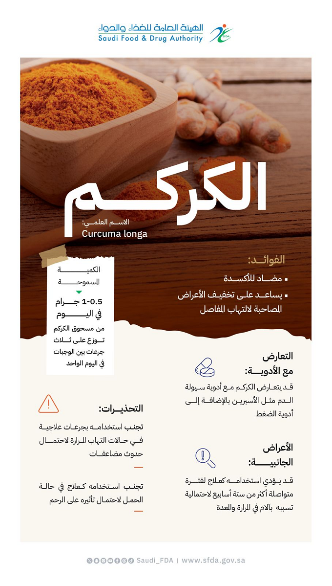 أوضحت الهيئة العامة للغذاء والدواء أن عشبة الكركم المعروفة علميًا باسم (Curcuma longa) تحمل قيمة عالية وفوائد عديدة، أهمها أنه يعد مضادًّا للأكسدة، ويساعد على تخفيف الأعراض المصاحبة لالتهاب المفاصل.