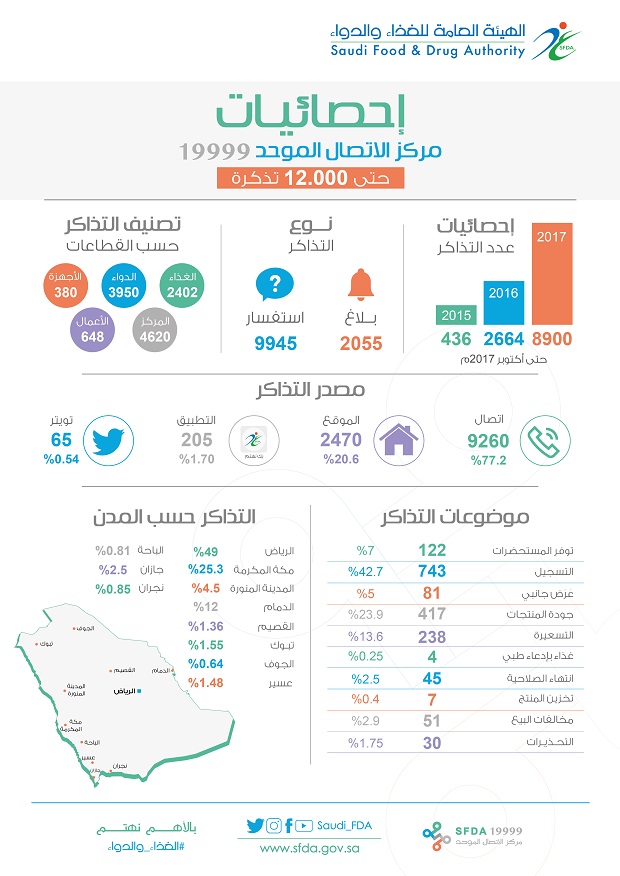 وتطرق إلى أن موضوعات التذاكر تراوحت بين 122 تذكرة عن توفر مستحضر، و743 تذكرة عن التسجيل، و81 تذكرة عن عرض جانبي، و417 تذكرة عن جودة المنتجات، و238 تذكرة عن التسعيرة، و4 تذاكر عن الغذاء بادعاء طبي، و45 تذكرة عن انتهاء الصلاحية، و7 تذاكر عن تخزين منتج، و51 تذكرة عن مخالفة بيع، و30 تذكرة عن التحذيرات الصادرة من الهيئة.