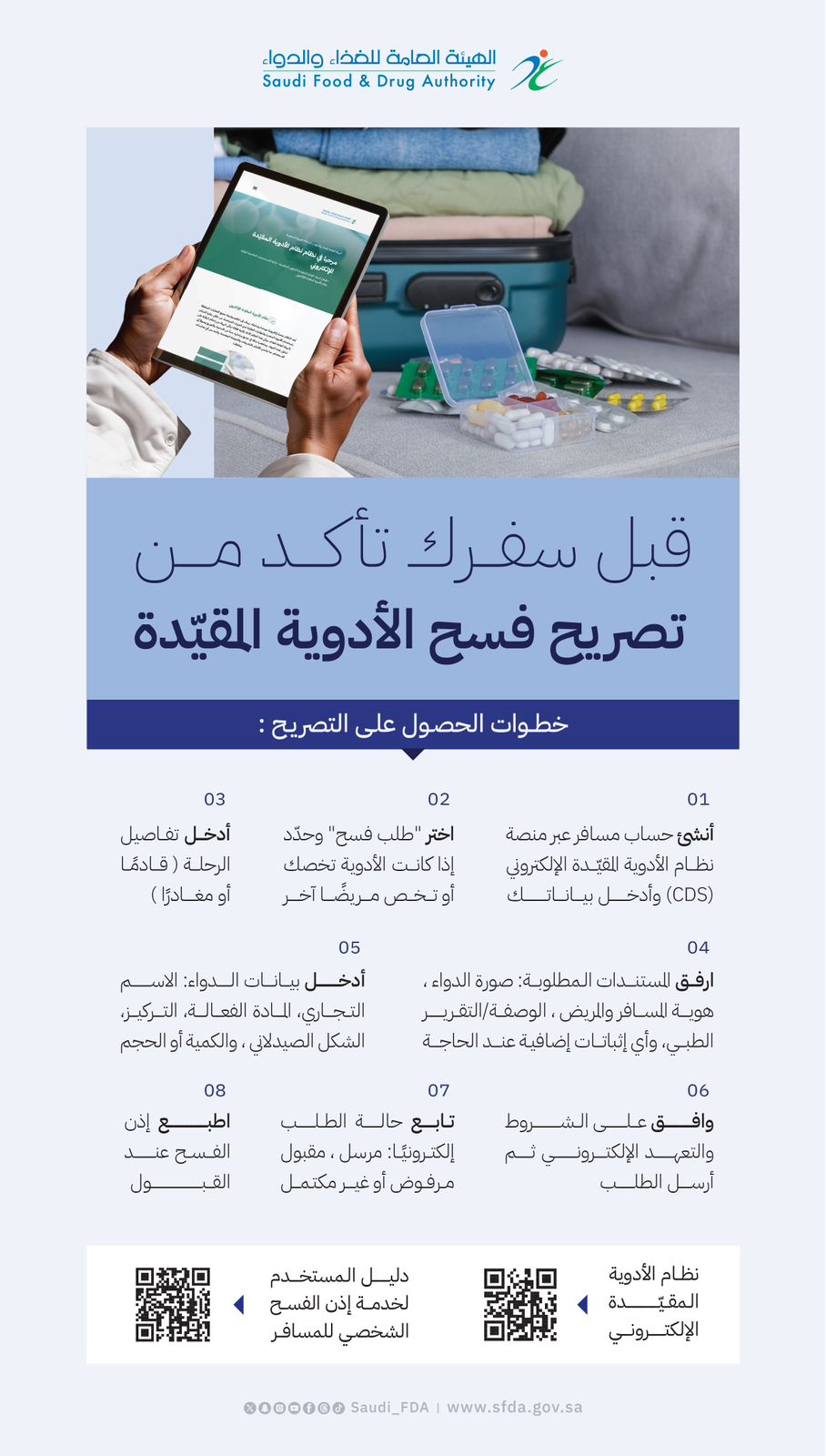 وأكّدت إتاحة جميع المعلومات المتعلقة بالخدمة عبر منصتها الإلكترونية "نظام الأدوية المقيّدة": https://cds.sfda.gov.sa، ويمكن للمسافر إنشاء حساب شخصي وتعبئة البيانات اللازمة، وتقديم طلب فسح إلكتروني يتضمن بيانات المريض وتفاصيل الرحلة والمرفقات المطلوبة مثل الوصفة أو التقرير الطبي وصورة الدواء وإثبات الهوية.