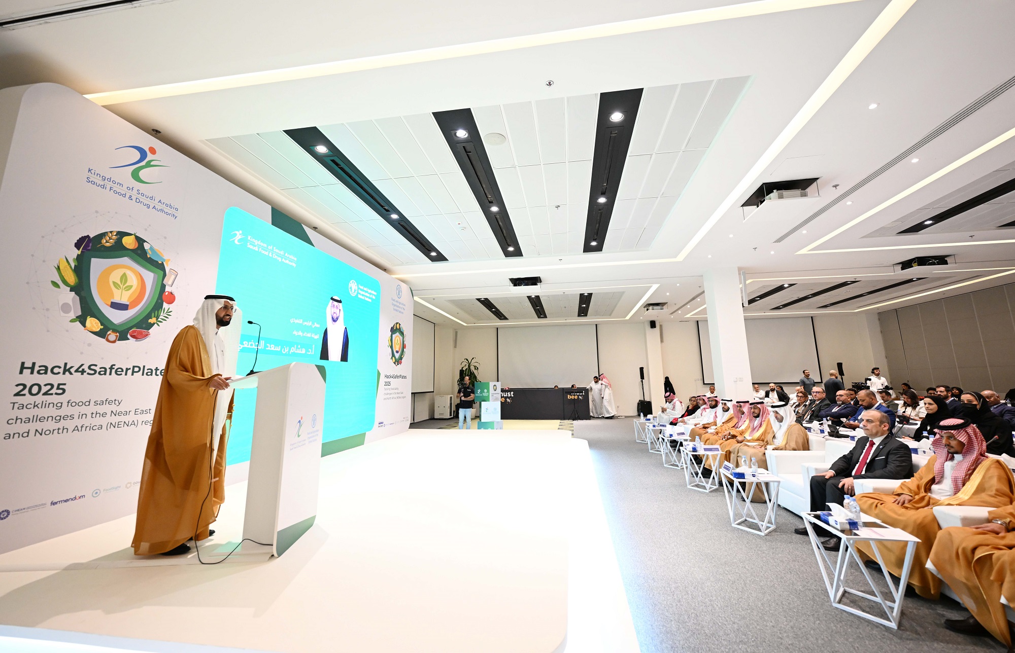 وأكد معالي الرئيس التنفيذي للغذاء والدواء اعتزاز الهيئة باستضافة هذا الحدث وتسخير إمكاناتها لدعم العقول المبدعة من مختلف دول الإقليم وشمال أفريقيا، مشيرًا إلى أن هذا التعاون مع منظمة الفاو يمثل خطوة مهمة في دعم الابتكار وتوظيف التقنية لتعزيز سلامة الغذاء وجودته. وأوضح أن ذلك يجسّد التزام الهيئة بدعم المبادرات الريادية وبناء منظومة غذائية أكثر أمانًا واستدامة، تُسهم في حماية المستهلك وتعزيز مكانة المملكة بصفتها مركزًا إقليميًّا رياديًّا للابتكار في هذا المجال.