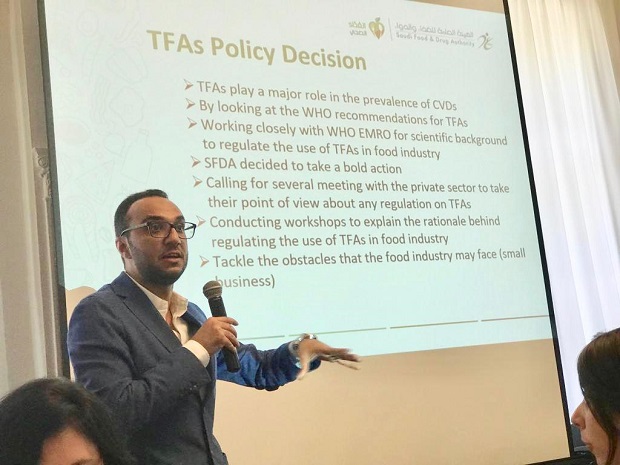 ومثّل الهيئة العامة للغذاء والدواء في الاجتماع مدير إدارة الغذاء الصحي فيصل بن فهد بن سنيد الذي قدّم عرضاً عن جهود "الغذاء والدواء" في منع الدهون المتحوّلة الاصطناعية في الصناعات الغذائية، واستراتيجية مشاركة "الهيئة" في تنظيم الغذاء الصحي التي انطلقت في سبتمبر ٢٠١٧.