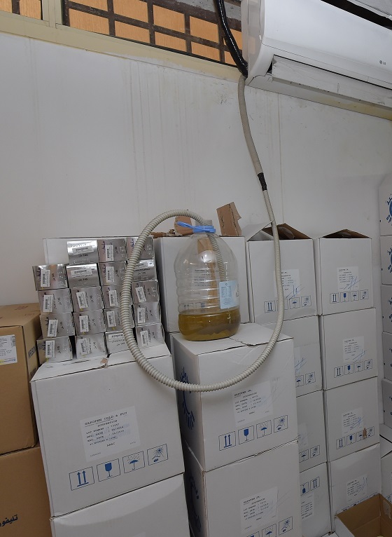 وتفوح من المستودع رائحة الصرف الصحي، إضافة إلى تسرب مياه من المكيفات على عبوات الأدوية التي توضع بعضها على الأرض مباشرة من دون عازل.