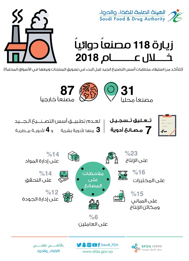 زار مفتشو الهيئة العامة للغذاء والدواء 118 مصنعاً دوائياً محلياً وخارجياً خلال العام 2018، للتأكد من استيفاء متطلبات أسس التصنيع الجيد قبل البدء في تسويق المنتجات وبيعها في الأسواق المحلية، وذلك لضمان مأمونية وسلامة الدواء في المملكة العربية السعودية.