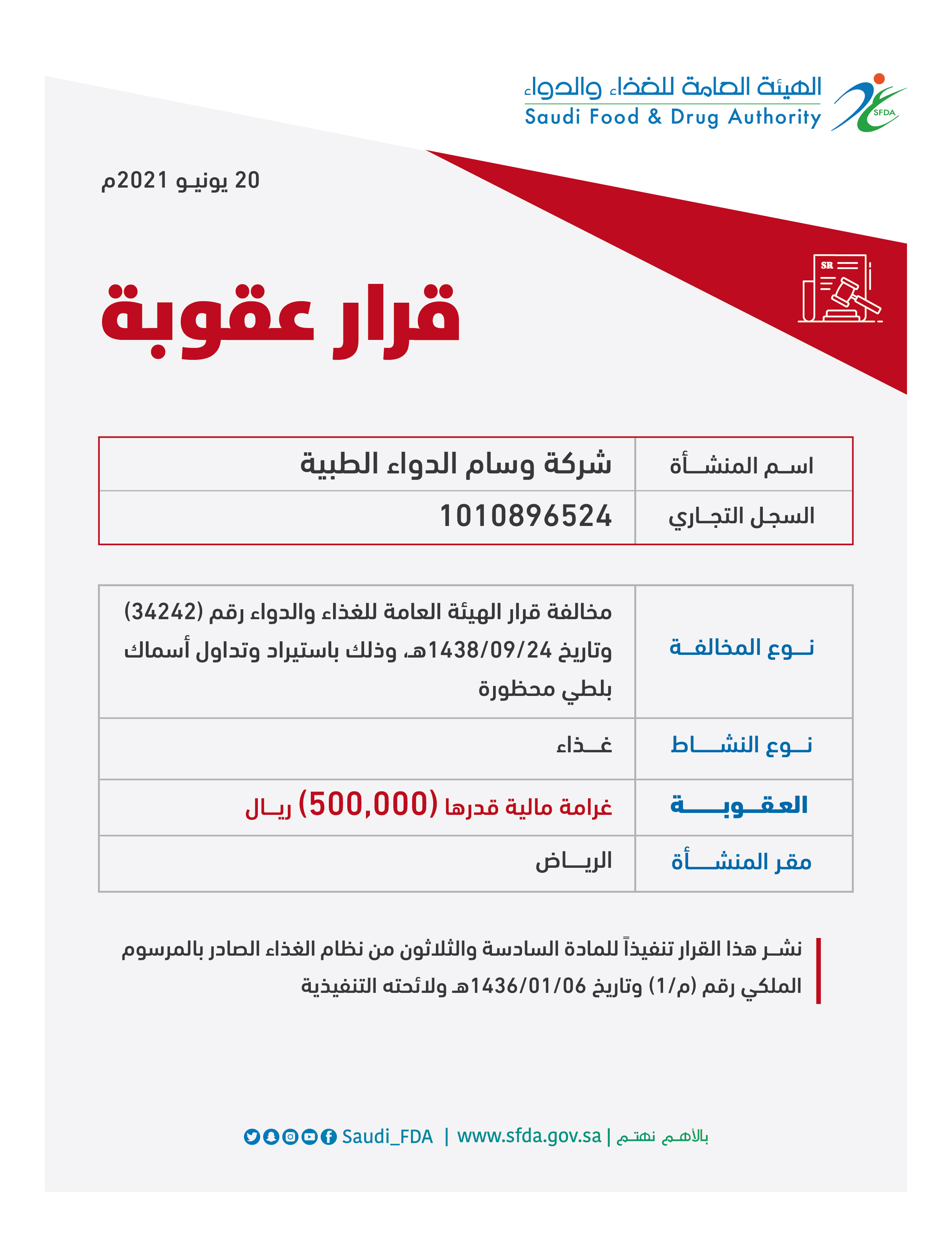 وغرامة مالية قدرها (500) ألف ريال على (شركة وسام الدواء الطبية ومقرها الرياض)، لمخالفتها قرار الهيئة رقم 34242 وتاريخ 24/09/1438هـ، باستيراد وتداول أسماك بلطي محظورة.