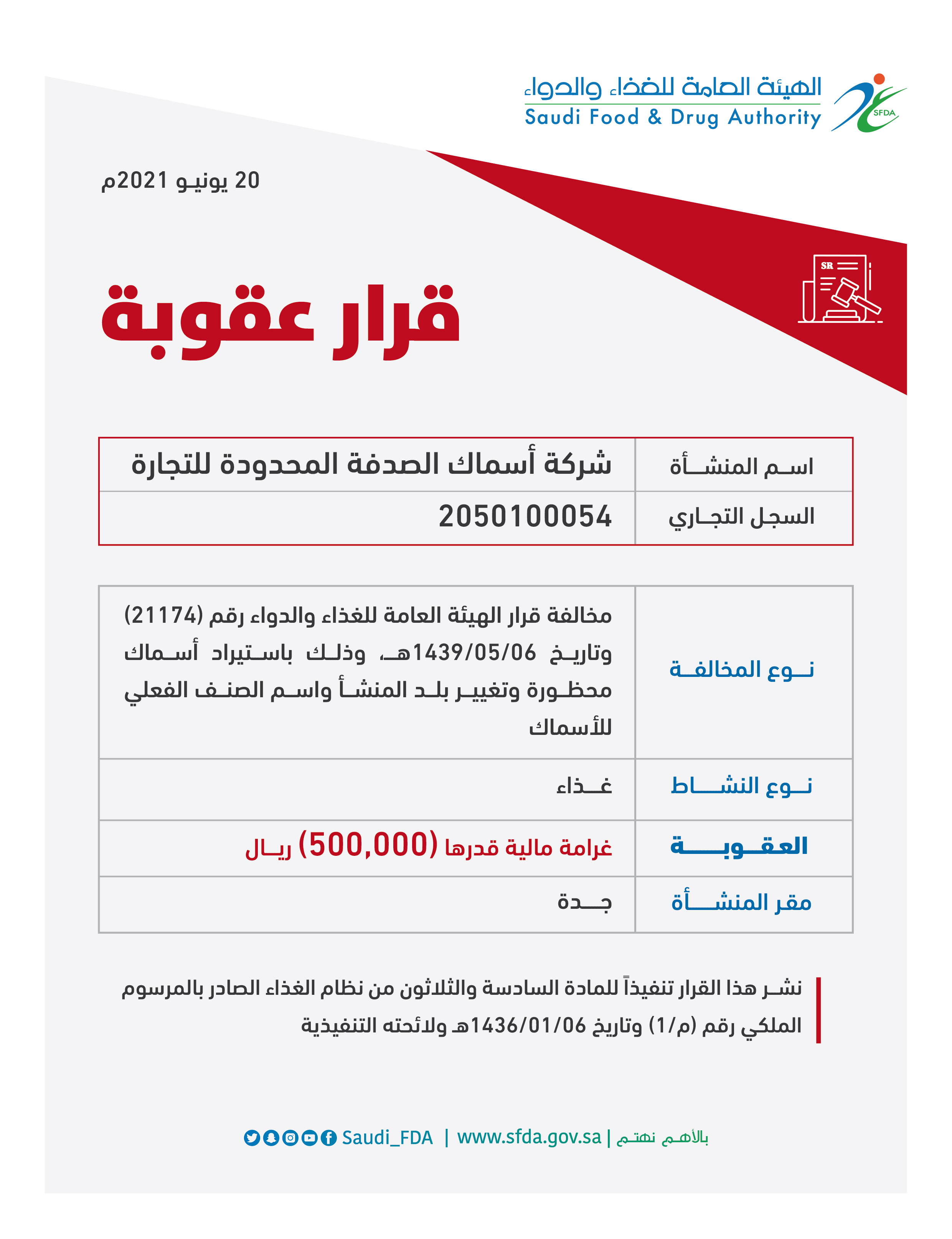 كما عاقبت منشأة غذائية (شركة أسماك الصدفة المحدودة للتجارة ومقرها محافظة جدة) بغرامة مالية قدرها 500 ألف ريال، لمخالفتها قرار الهيئة العامة للغذاء والدواء رقم 21174 وتاريخ 06/05/1439هـ، باستيراد أسماك محظورة وتغيير بلد المنشأ واسم الصنف الفعلي للأسماك.
