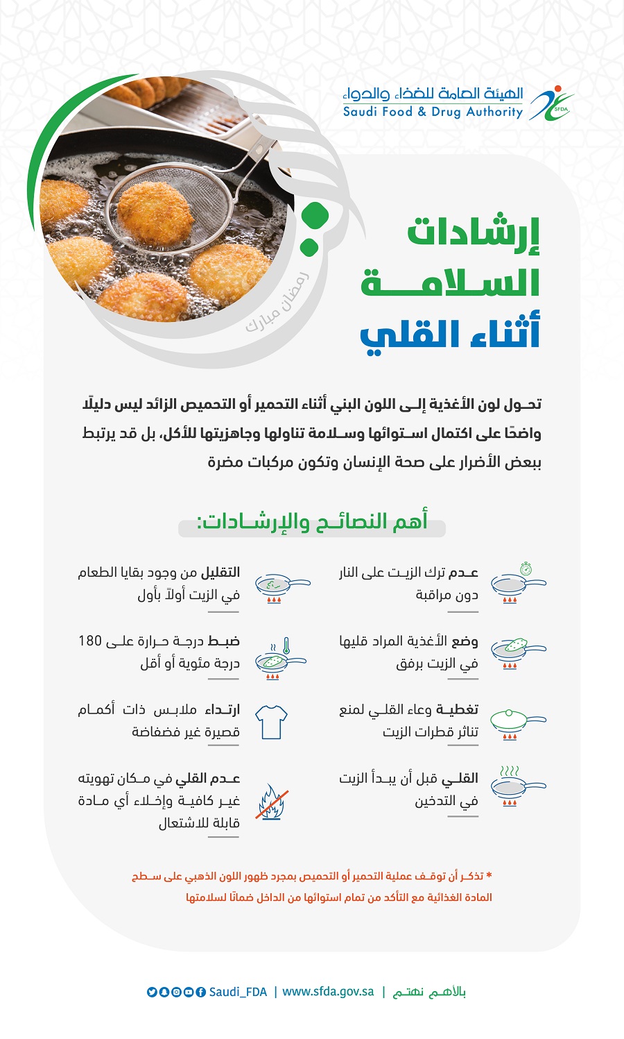 وللسلامة أثناء القلي، أوصت "الهيئة" بعدم ترك الزيت على النار دون مراقبة تحت أي ظرف، وأن تكون أكمام الملابس قصيرة غير فضفاضة، وتوضع الأغذية المراد قليها في الزيت برفق قبل أن يبدأ الزيت في التدخين، وتغطية وعاء القلي لمنع تناثر قطرات الزيت أثناء القلي، وعدم القلي في مكان ضيق تهويته غير كافية، وإخلاء منطقة القلي وما حولها من أي مادة قابلة للاشتعال، والاحتفاظ بطفاية حريق مناسبة جاهزة للاستعمال.