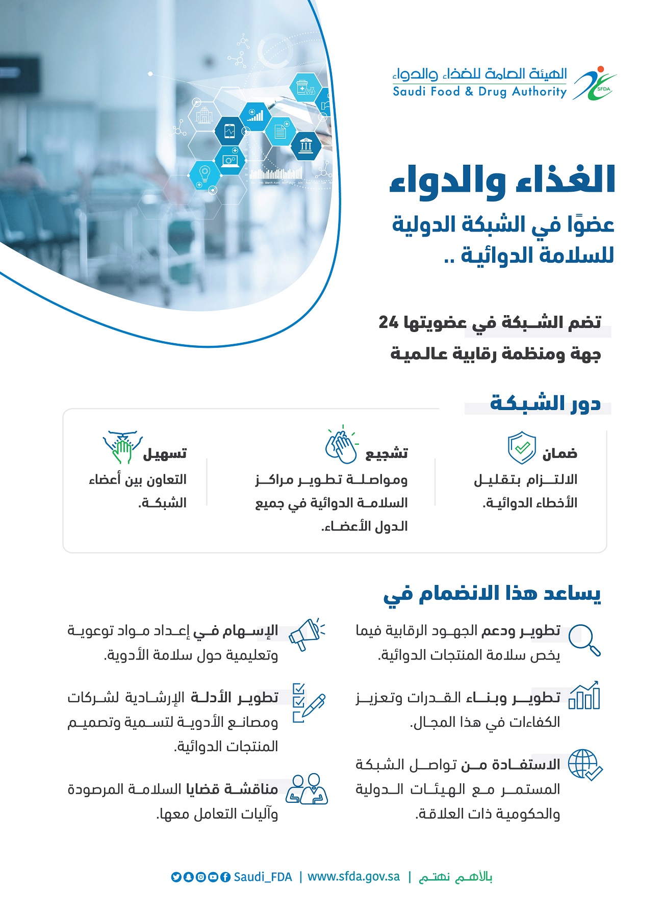 انضمت الهيئة العامة للغذاء والدواء مؤخرًا إلى الشبكة الدولية للسلامة الدوائية (International Medication Safety Network –IMSN)، وذلك بعد استيفاء جميع المتطلبات والمعايير اللازمة للحصول على عضوية الشبكة.
