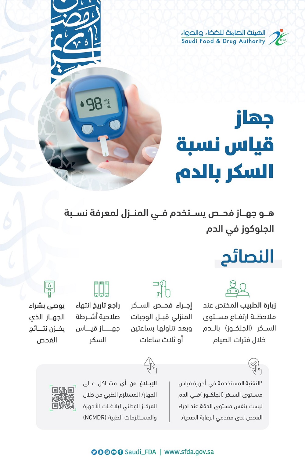 أوصت الهيئة العامة للغذاء والدواء إلى إجراء فحص السكر المنزلي قبل الوجبات وبعد تناولها بساعتين أو ثلاث ساعات، واتباع إرشادات الاستخدام الخاصة بالجهاز المنزلي لقياس نسبة السكر بالدم، لضمان سلامة الجهاز وظهور القراءات الصحيحة.