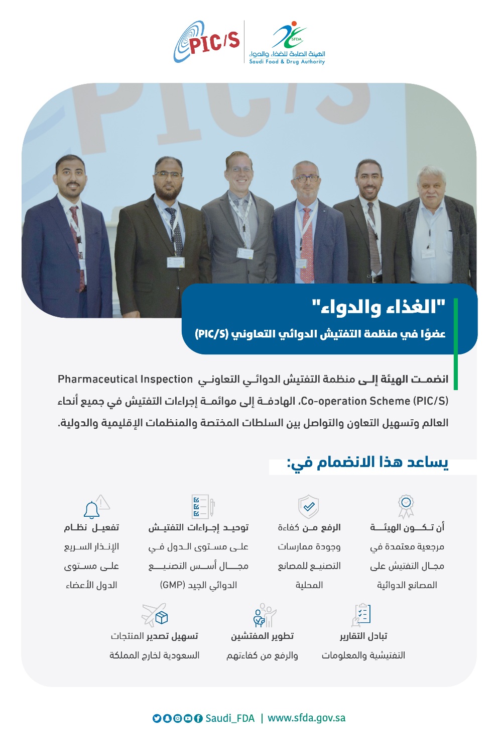 انضمت الهيئة العامة للغذاء والدواء إلى منظمة التفتيش الدوائي التعاوني Pharmaceutical Inspection Co-operation Scheme (PIC/S)، الهادفة إلى موائمة إجراءات التفتيش في جميع أنحاء العالم وتسهيل التعاون والتواصل بين السلطات المختصة والمنظمات الإقليمية والدولية وذلك بعد استيفاء جميع المتطلبات والمعايير اللازمة للانضمام وحصول الهيئة على الموافقة من اللجان المختصة في المنظمة وموافقة الدول الأعضاء خلال اجتماع المنظمة الذي تم في مدينة جنيف السويسرية خلال الفترة من 11-12 مايو الجاري، إذ تعد المملكة أول دولة عربية يتم قبولها في المنظمة.