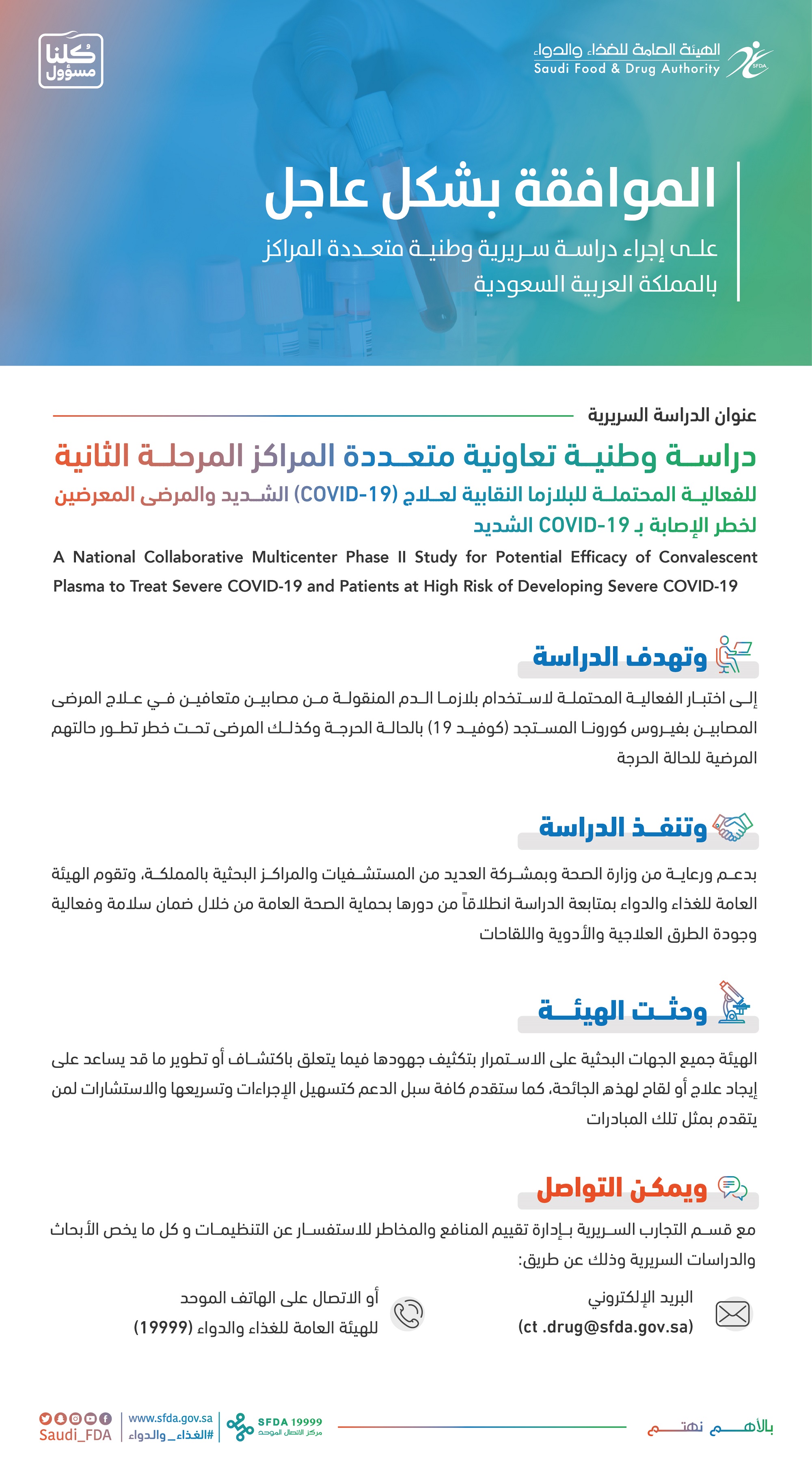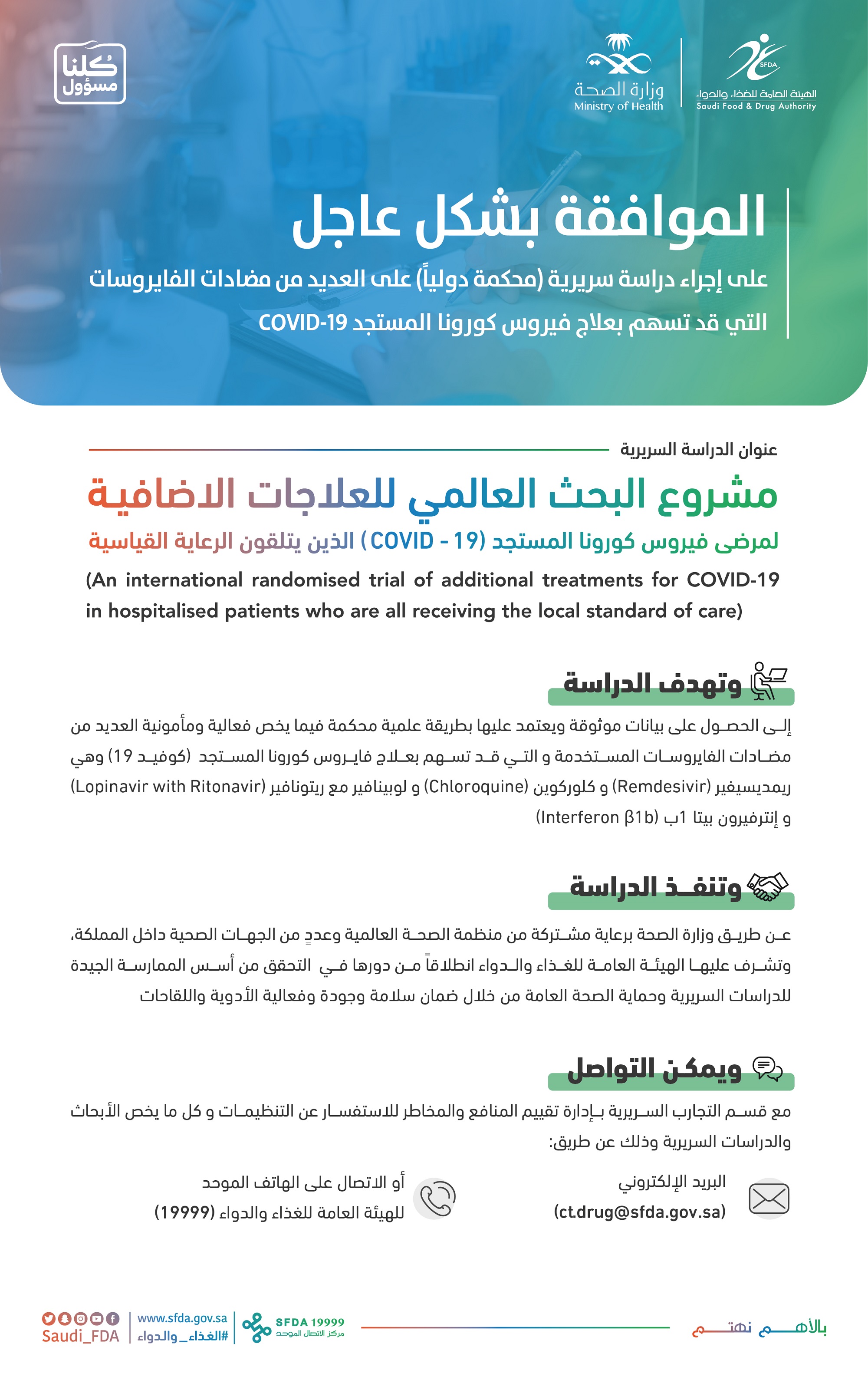جهود الهيئة في مواجهة الجائحة الإجراءات التشريعية في أزمة كورونا ( COVID-19) دراسة وطنية تعاونية متعددة المراكز المرحلة الثانية للفعالية المحتملة للبلازما النقابية لعلاج ( COVID-19 ) الشديد والمرضى المعرضين لخطر الاصابة ب COVID-19 الشديد تجربة دواء فافيبرافير وهايدروكسي كلوروكين لعلاج المرضى المصابين بفيروس كورونا المستجد ( كوفيد 19) بأعراض متوسطة وشديدة : دراسة متعددة المراكز مشروع البحث العالمي للعلاجات الاضافية لمرضى فيروس كورونا المستجد ( COVID-19 ) الذين يتلقون الرعاية القياسية
