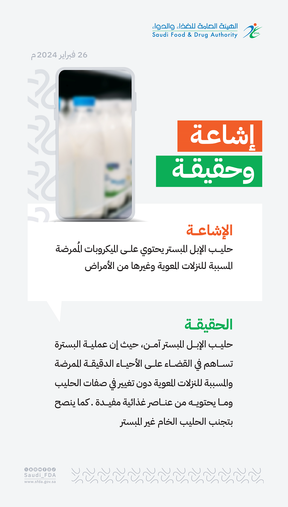 حليب الإبل المبستر يحتوي على الميكروبات المُمرضة المسببة للنزلات المعوية وغيرها من الأمراض.