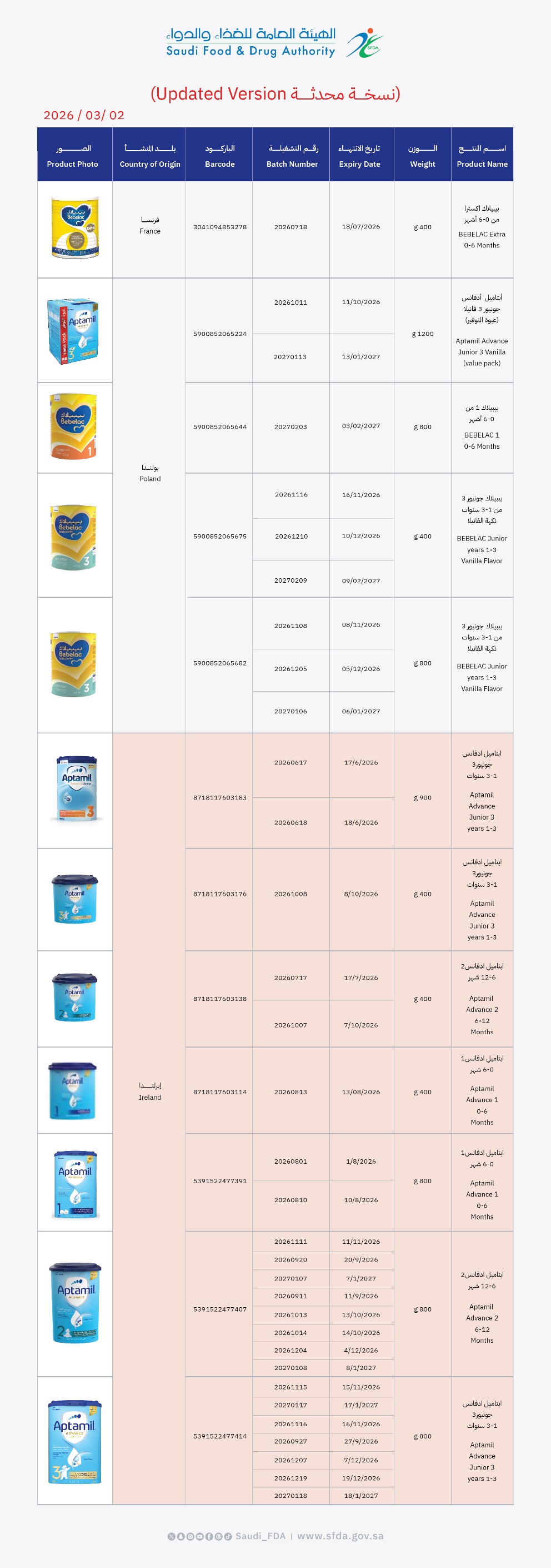 أصدرت الهيئة العامة للغذاء والدواء تحذيرًا بشأن عدد من منتجات حليب الأطفال التابعة لشركة "نوتريشيا دانون" للعلامتين التجاريتين (Bebelac و Aptamil)، وذلك إثر إبلاغ طوعي من الشركة وسحبها احترازيًا لبعض التشغيلات لاحتمالية تلوثها بمادة "سيريوليد" (Cereulide) التي تفرزها بكتيريا "باسيلس سيريوس" (Bacillus cereus)، التي قد تشكل خطرًا على صحة الرضع.