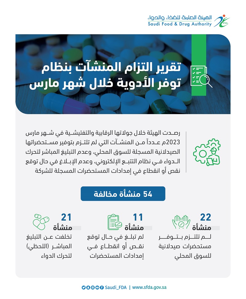 فرضت الهيئة العامة للغذاء والدواء عقوبات على (54) منشأة مخالفة لنظام المنشآت والمستحضرات الصيدلانية والعشبية منها عدم الالتزام بتوفير المستحضرات الصيدلانية المسجلة للسوق المحلي، وعدم التبليغ المباشر لتحرك الدواء في نظام التتبع الالكتروني، وعدم إبلاغ "الهيئة" عن توقع نقص أو انقطاع في إمداد المستحضرات المسجلة للشركة خلال شهر مارس الماضي.