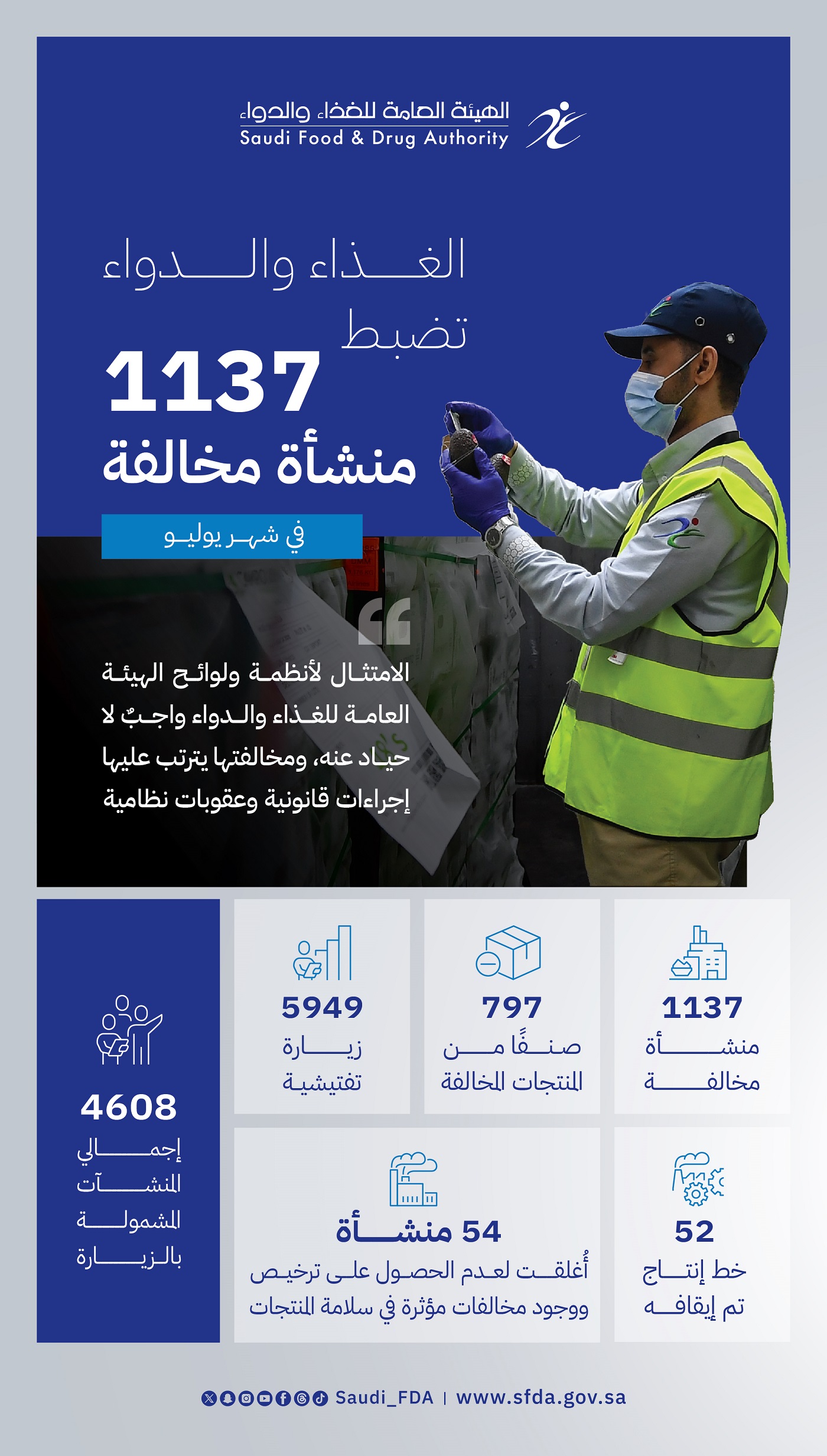 نفّذت فرق الرصد والتقصي التابعة للهيئة العامة للغذاء والدواء في شهر يوليو الماضي ( 5,949 ) زيارة تفتيشية شملت ( 4,608 ) منشأة خاضعة لإشرافها.