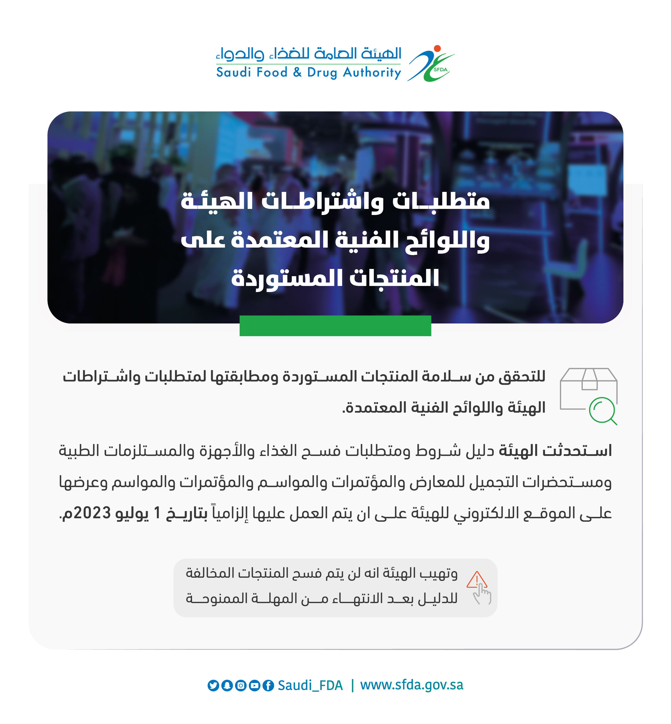 أعلنت الهيئة العامة للغذاء والدواء اعتماد تحديث اللائحة الفنية رقم SFDA.CO/GSO 1943:2024 بعنوان "مستحضرات التجميل - متطلبات السلامة في مستحضرات التجميل ومنتجات العناية الشخصية" واللائحة الفنية رقم SFDA.CO/GSO 2528:2024 بعنوان "مستحضرات التجميل- لائحة ادعاءات مستحضرات التجميل والعناية الشخصية" وذلك باللغتين العربية والإنجليزية.