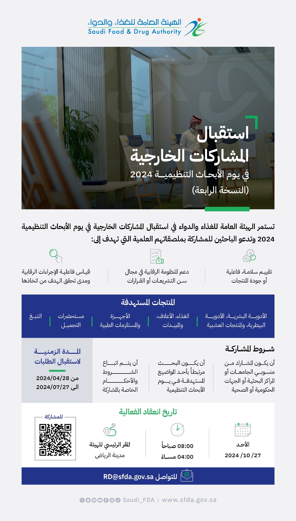 الغذاء والدواء تعلن استمرار استقبال المشاركات الخارجية في يوم الأبحاث التنظيمية 2024