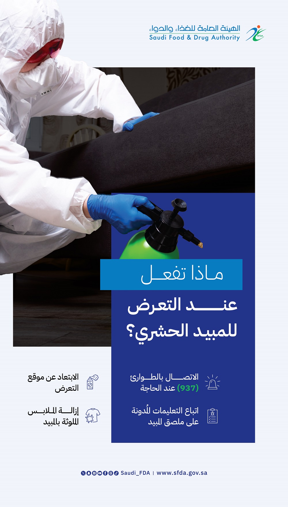 أكدت الهيئة العامة للغذاء والدواء أهمية عدم التعرض للمبيدات الحشرية، وذلك للخطر الكبير الذي تشكله تلك المبيدات في حال عدم معرفة الطرق الصحيحة للتعامل معها.