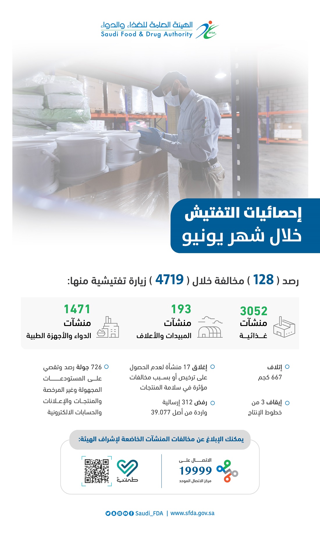 رصدت الهيئة العامة للغذاء والدواء (128) مخالفة خلال (4719) زيارة تفتيشية نفذتها على منشآت خاضعة لإشرافها في شهر يونيو 2023م.