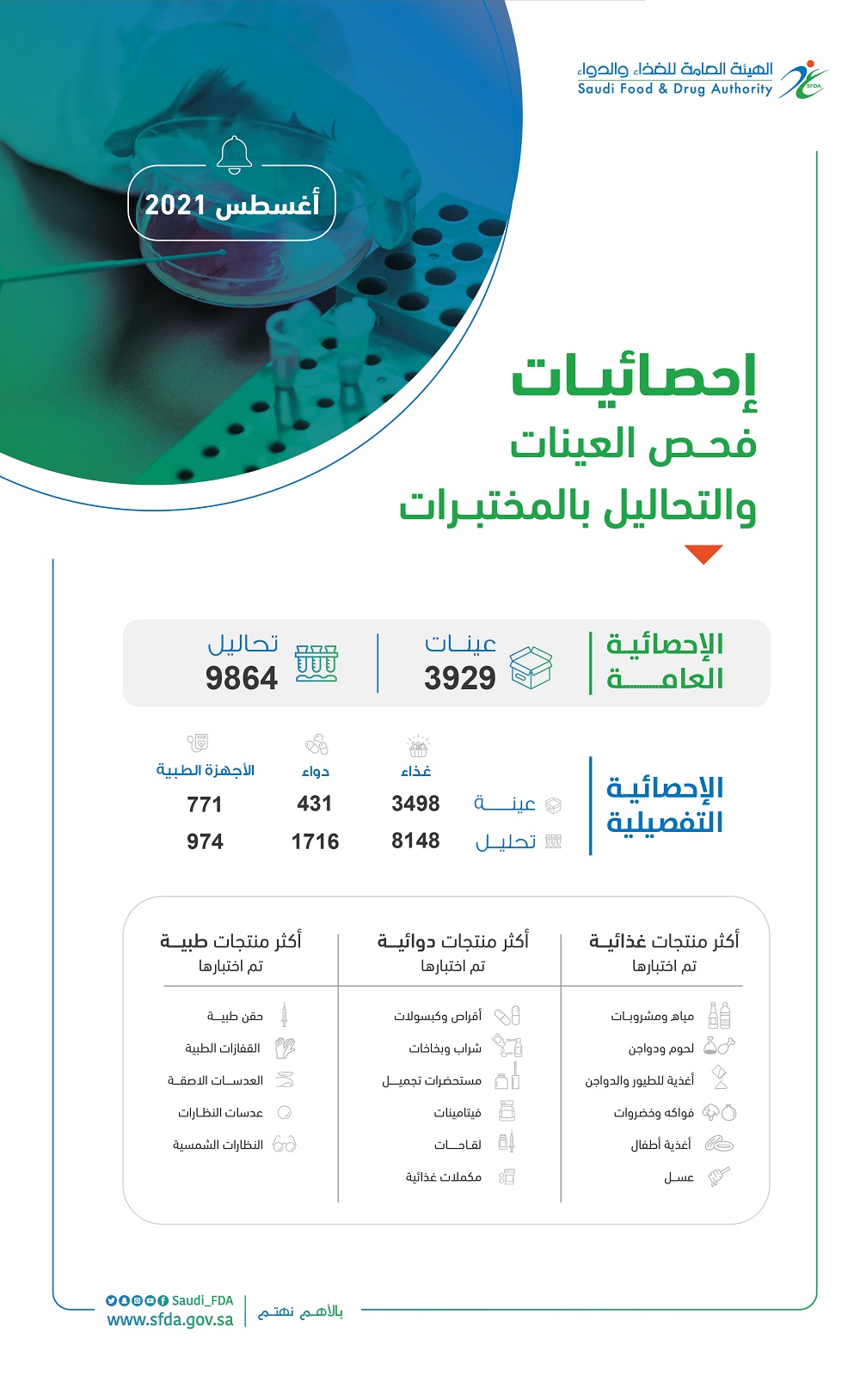 أجرت الهيئة العامة للغذاء والدواء ما يزيد على 9864 تحليلاً مخبرياً على 3929 عينة في مختبراتها خلال شهر أغسطس من العام الحالي، وتصدرت العينات التي شملها التحليل مياه الشرب ولحوم الدواجن والأقراص والكبسولات الدوائية والحقن والقفازات الطبية أكثر العينات التي شملها التحليل.