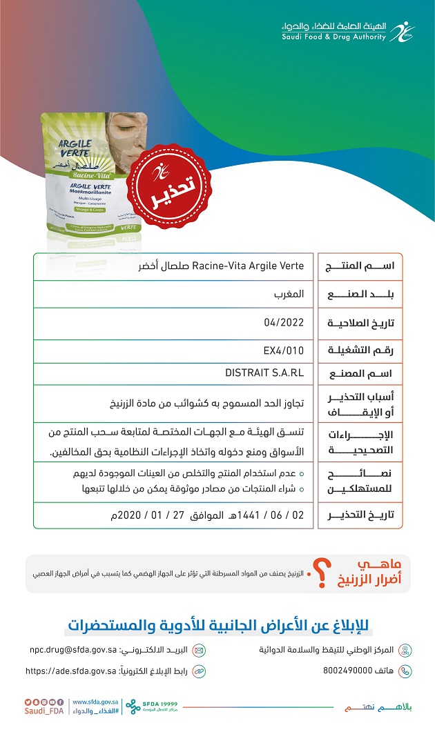 حذّرت الهيئة العامة للغذاء والدواء من منتجين للعناية بالبشرة يتم استخدامهما كقناع للوجه وذلك لاحتوائهما على نسبة عالية من مادة الزرنيخ.