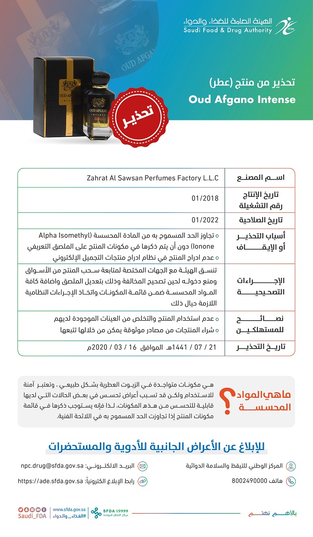ويحمل المنتج الأول اسم " Oud Afgano Intense " وتاريخ صلاحية 01/2022، فيما يحمل المنتج الثاني اسم "عود الحبايب Oud Al Habayeb " بتاريخ صلاحية 36 شهر بعد الفتح.