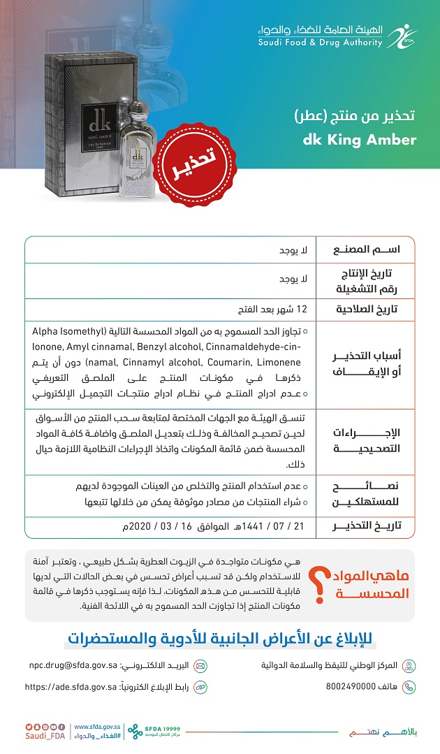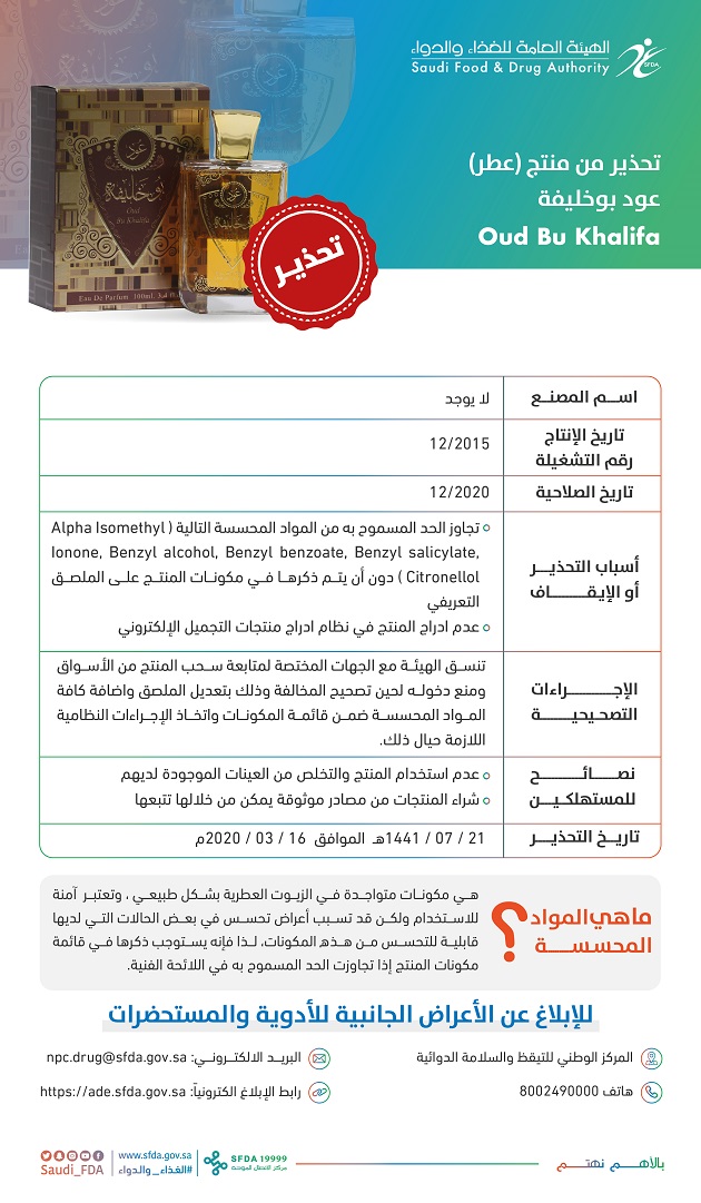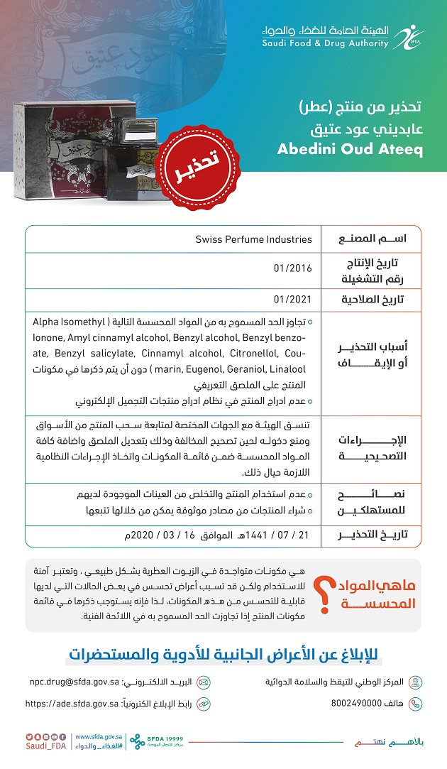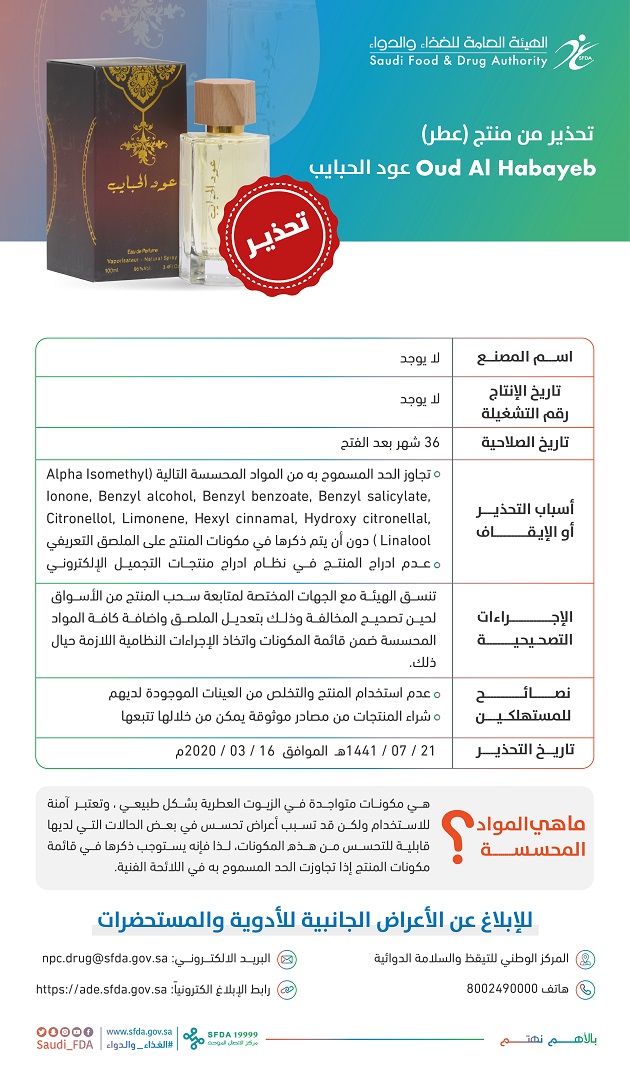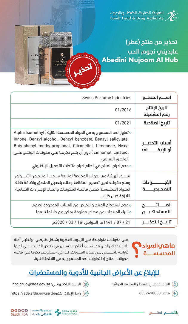 وأوضحت الهيئة أنها حلّلت عينات من منتجات التجميل المتداولة بالأسواق المحلية للتأكد من سلامتها، وأظهرت نتائج التحليل احتواء 13 منتجاً على نسب عالية من مواد محسسة تجاوزت الحد المسموح به دون ذكرها في مكونات المنتجات على الملصق التعريفي حسب اشتراطات لائحة متطلبات السلامة في مستحضرات التجميل والعناية الشخصية رقم SFDA.CO/GSO 1943:2016، مشيرة إلى أن التعرض لنسب عالية من تلك المواد قد يسبب مخاطر صحية للمستهلكين الذين لديهم حساسية تجاهها.