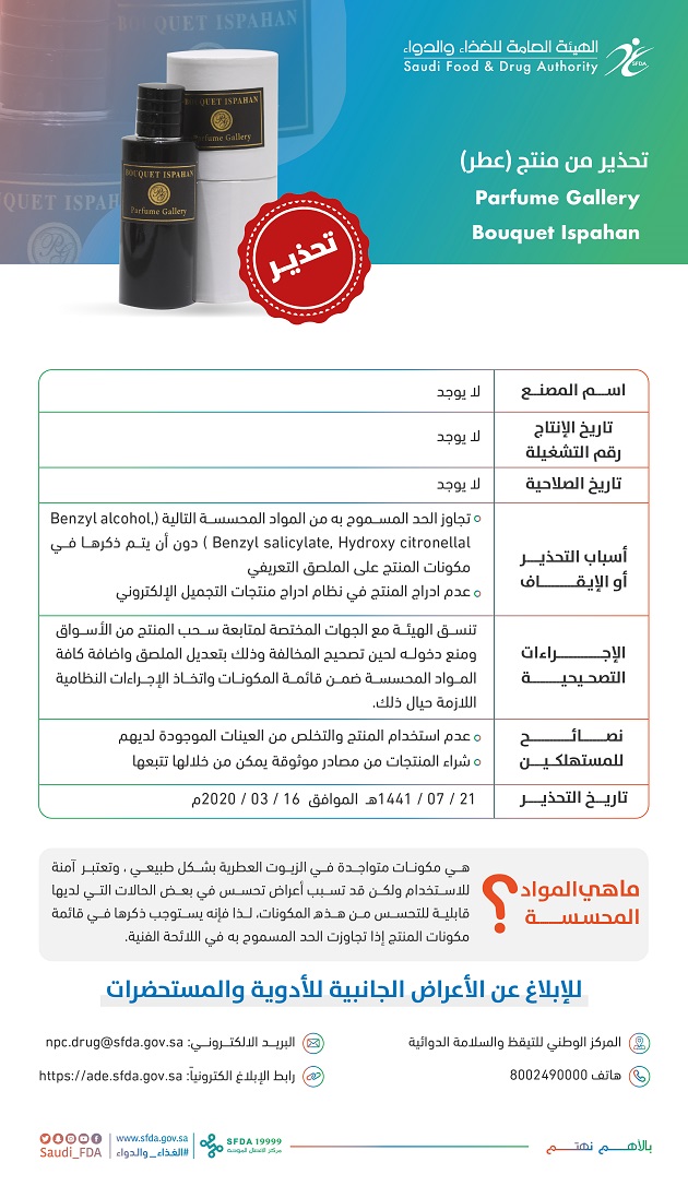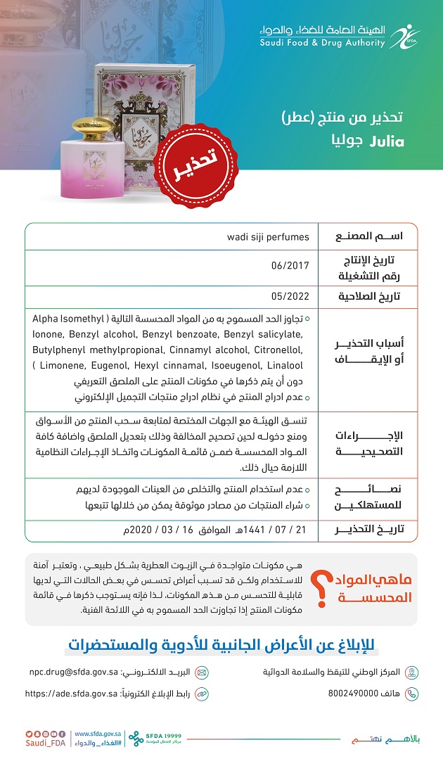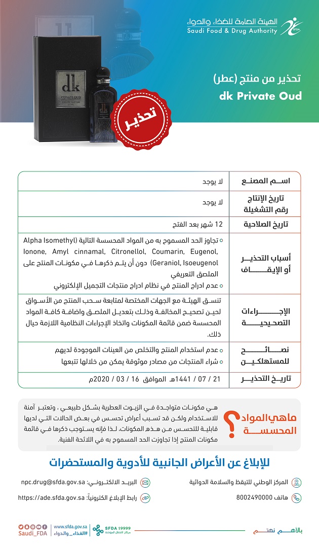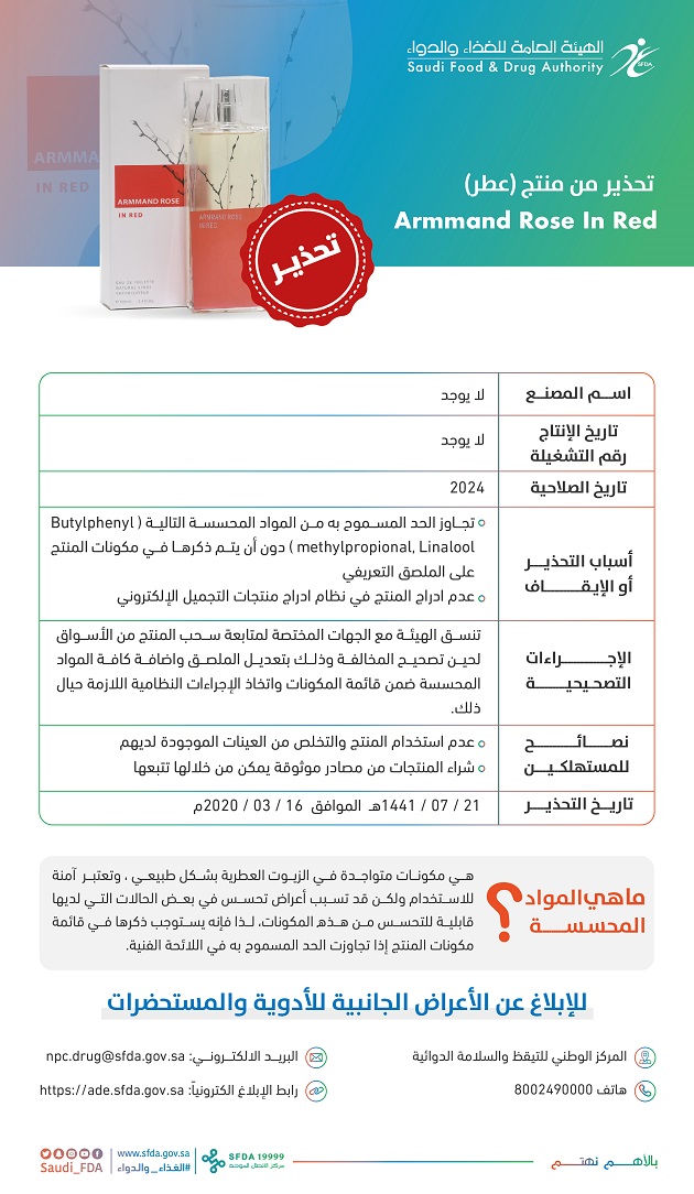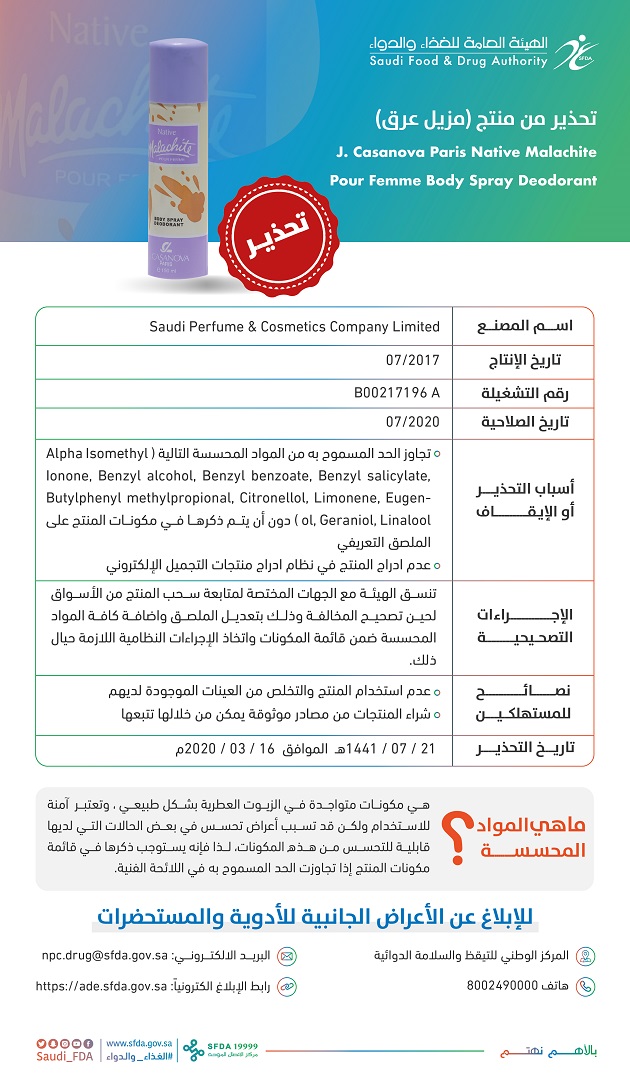 وأوضحت الهيئة أنها حلّلت عينات من منتجات التجميل المتداولة بالأسواق المحلية للتأكد من سلامتها، وأظهرت نتائج التحليل احتواء 13 منتجاً على نسب عالية من مواد محسسة تجاوزت الحد المسموح به دون ذكرها في مكونات المنتجات على الملصق التعريفي حسب اشتراطات لائحة متطلبات السلامة في مستحضرات التجميل والعناية الشخصية رقم SFDA.CO/GSO 1943:2016، مشيرة إلى أن التعرض لنسب عالية من تلك المواد قد يسبب مخاطر صحية للمستهلكين الذين لديهم حساسية تجاهها.