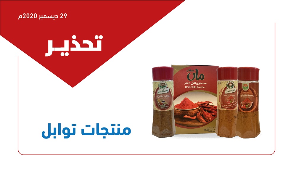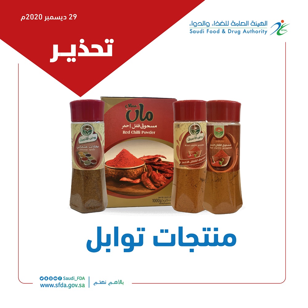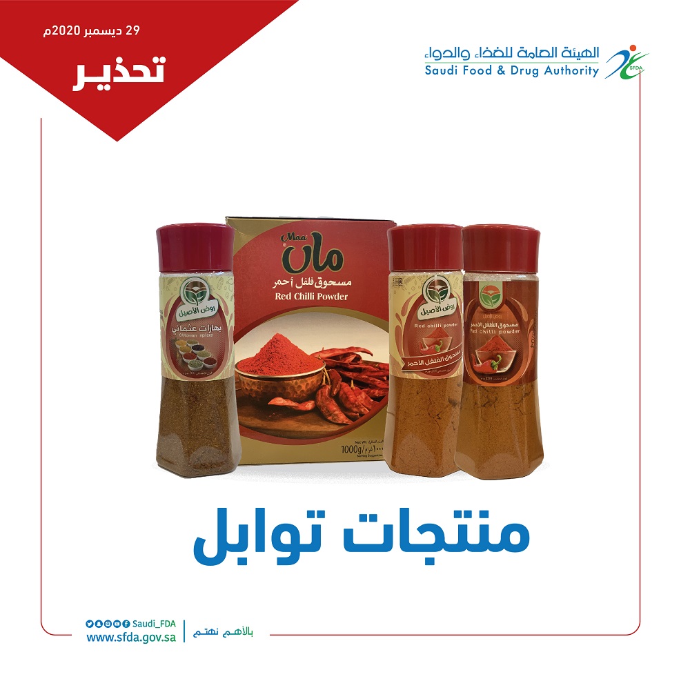 وأوضحت "الغذاء والدواء" أن المنتجات هي (مسحوق فلفل أحمر) للعلامة التجارية (Maa) بجميع الأوزان والتشغيلات وتواريخ الصلاحية، ومنتجي (بهارات عثماني، ومسحوق الفلفل الأحمر) للعلامة التجارية (روض الأصيل) بجميع الأوزان والتشغيلات وتواريخ الصلاحية.