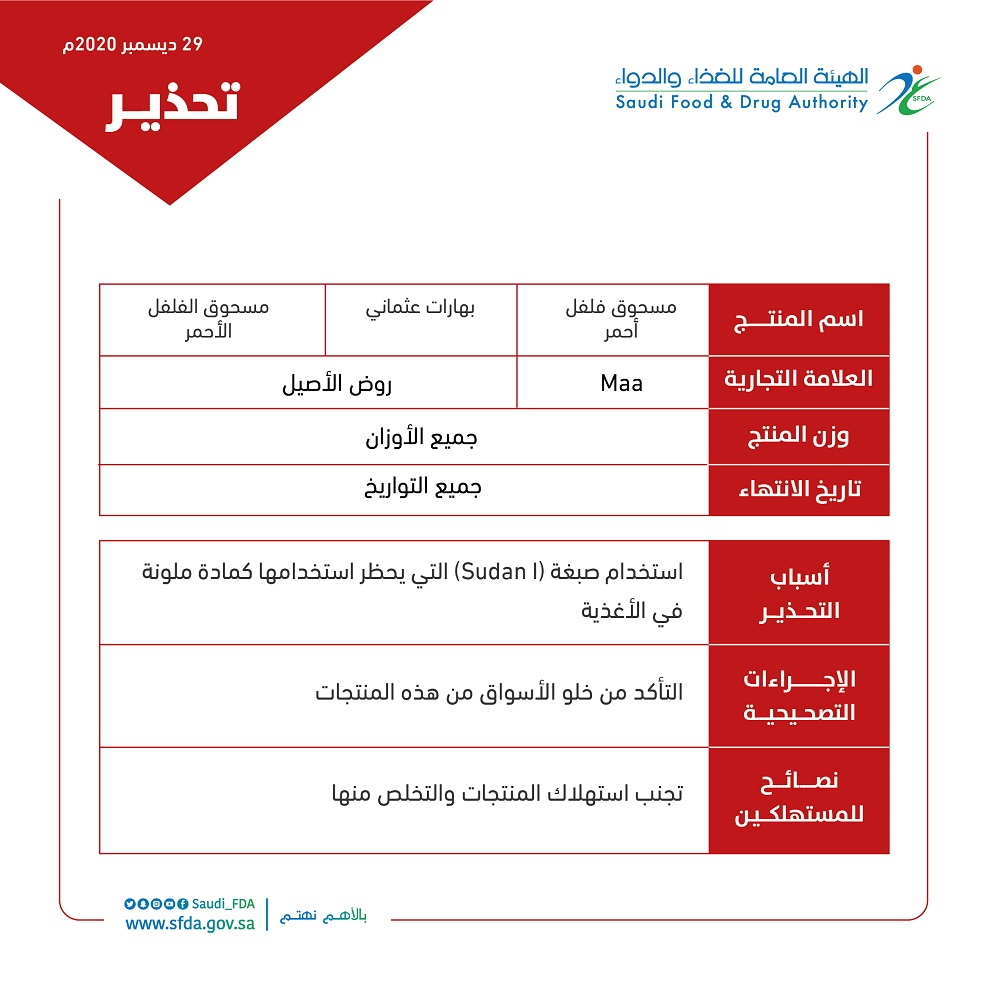 حذّرت الهيئة العامة للغذاء والدواء من ثلاثة منتجات توابل، بسبب احتوائها على صبغة (Sudan I) المحظور استخدامها في المنتجات الغذائية لاحتمالية تأثيرها على صحة المستهلك.