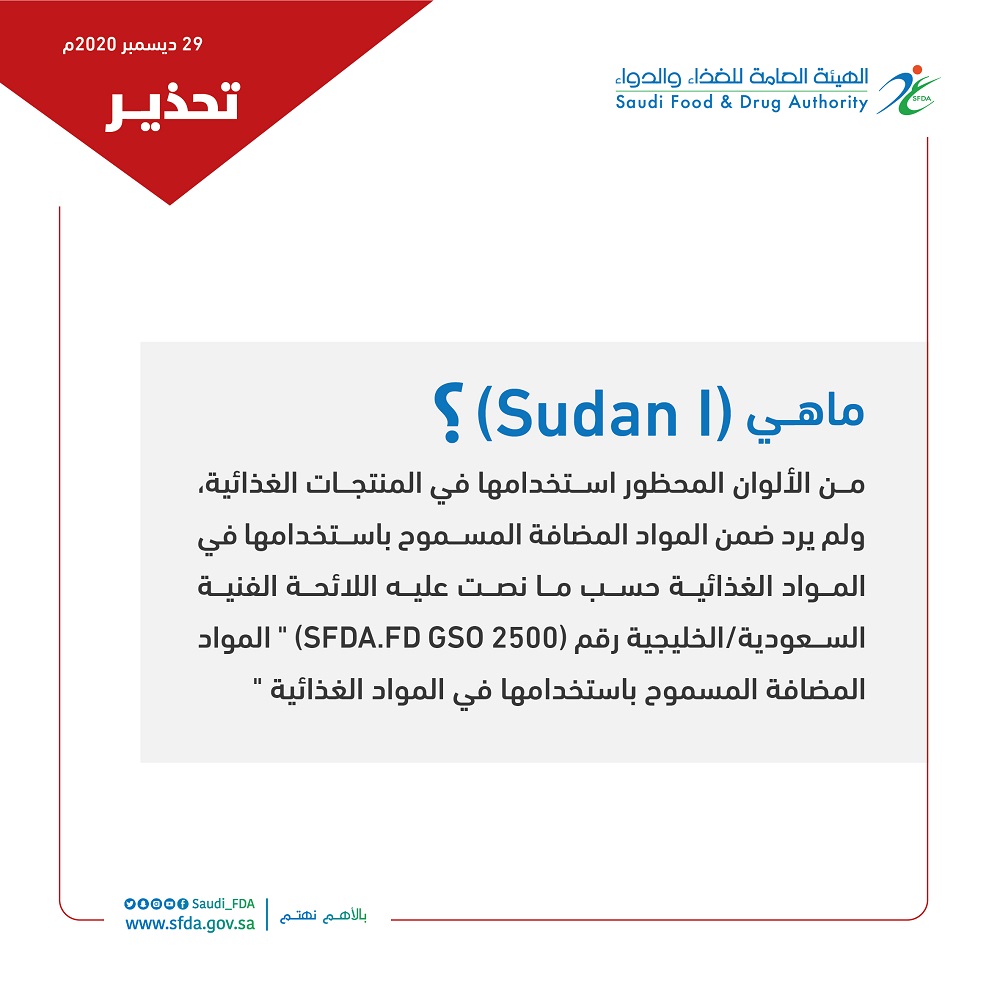 وأشارت "الهيئة" أن صبغة (Sudan I) تضاف لتعزيز اللون الأحمر في المنتجات الغذائية، وهي مادة يُحظر إضافتها للمنتجات الغذائية لاحتمالية تأثيرها على صحة المستهلك.