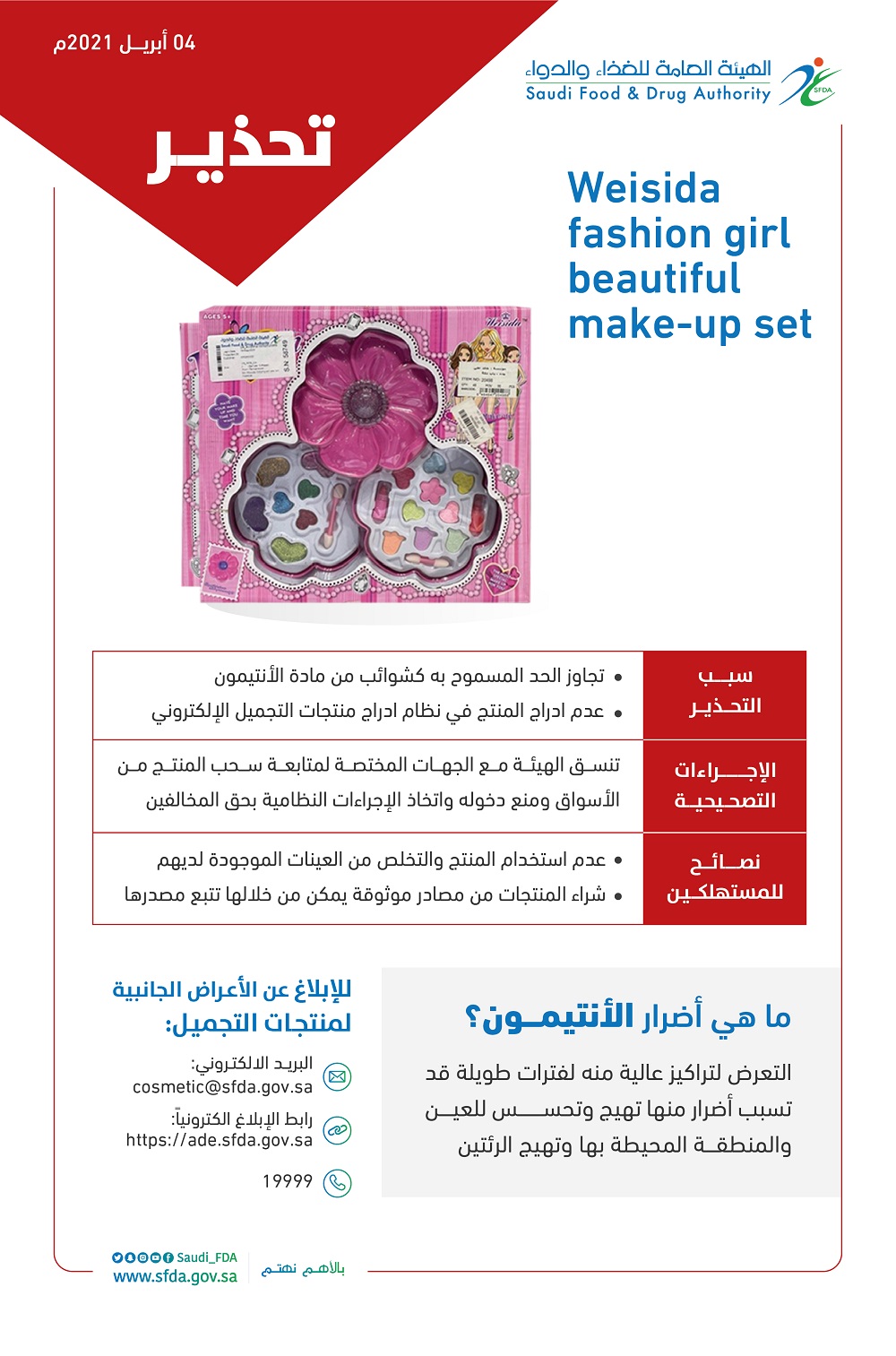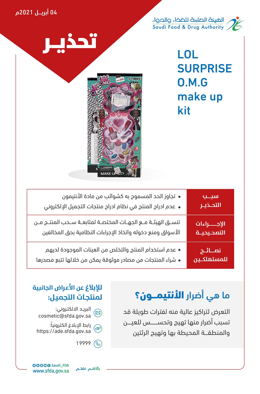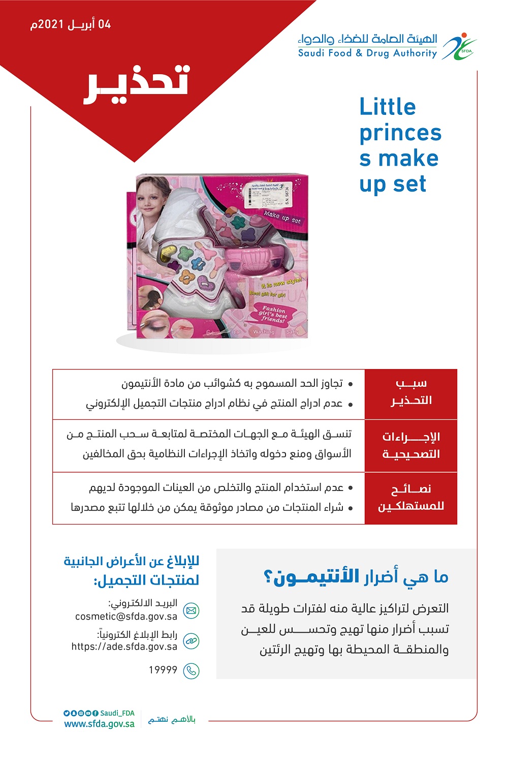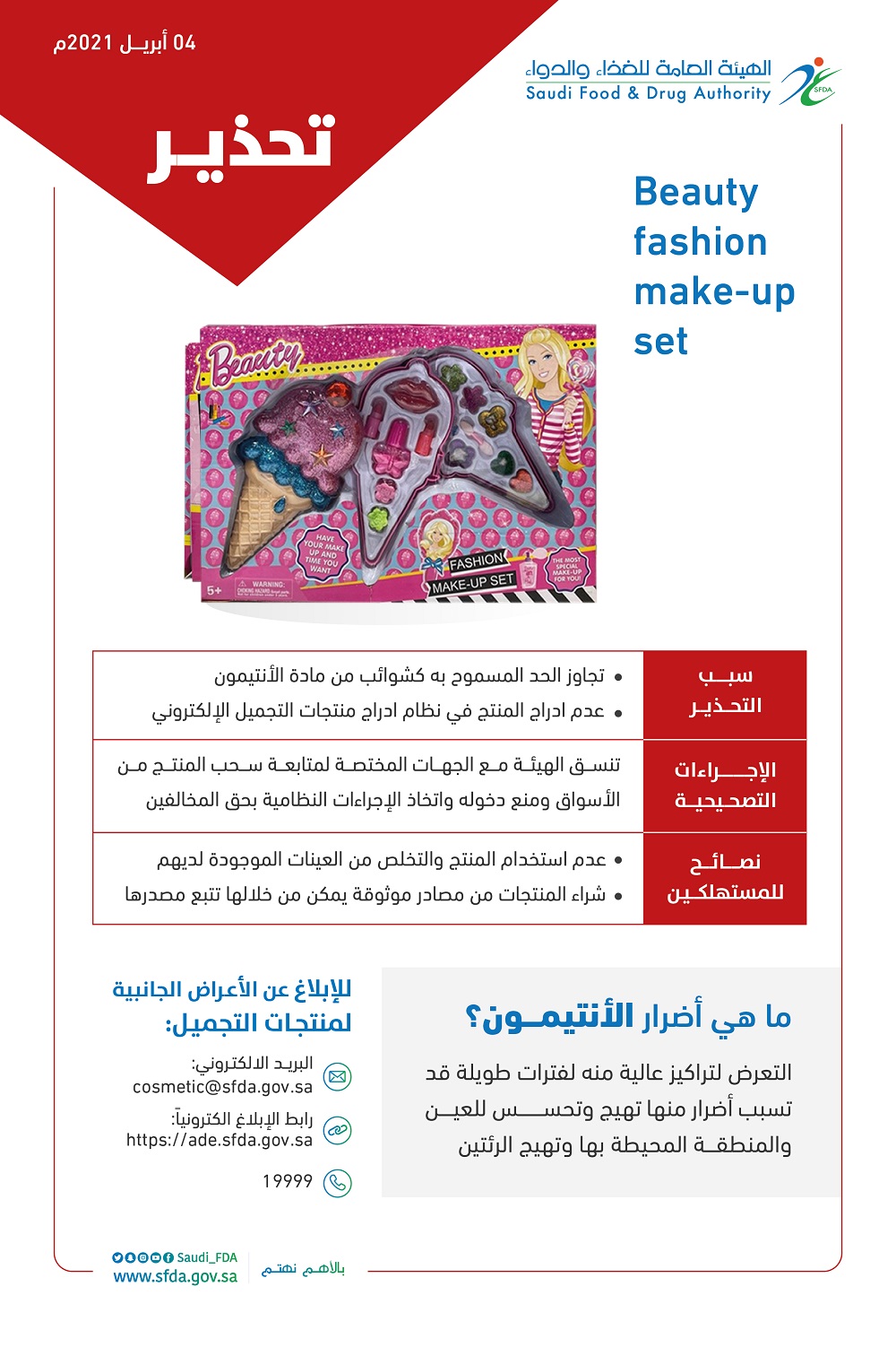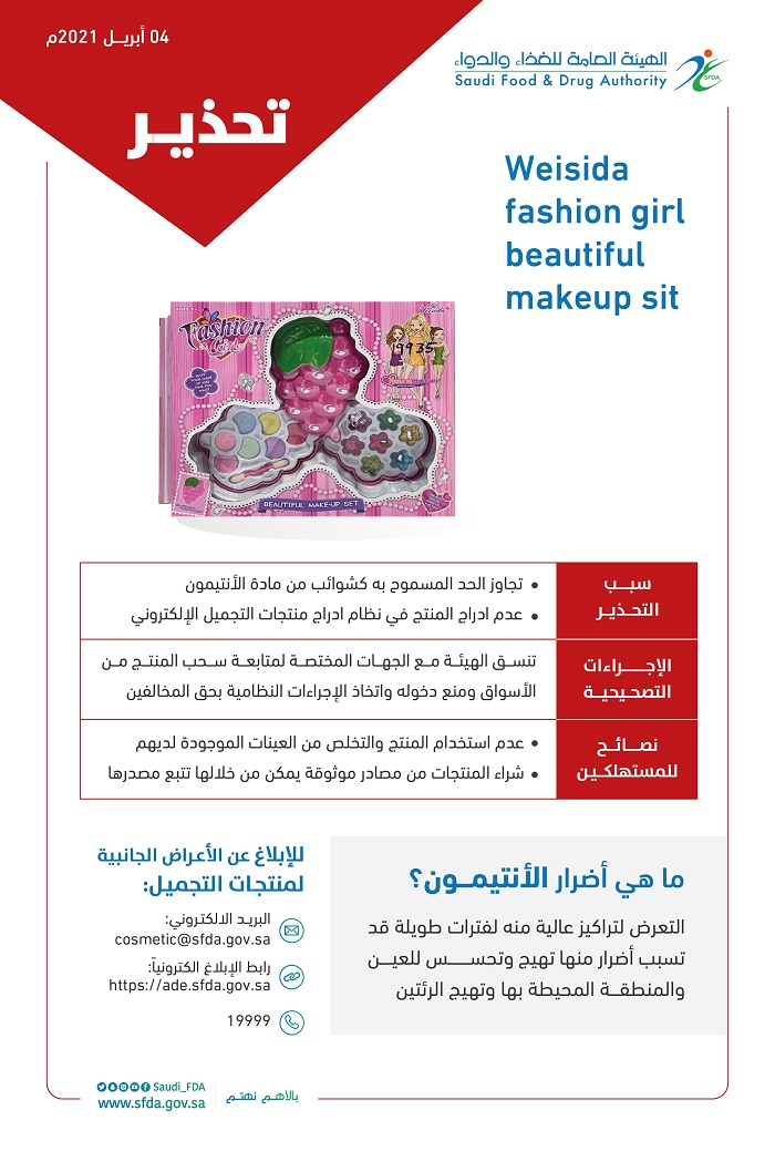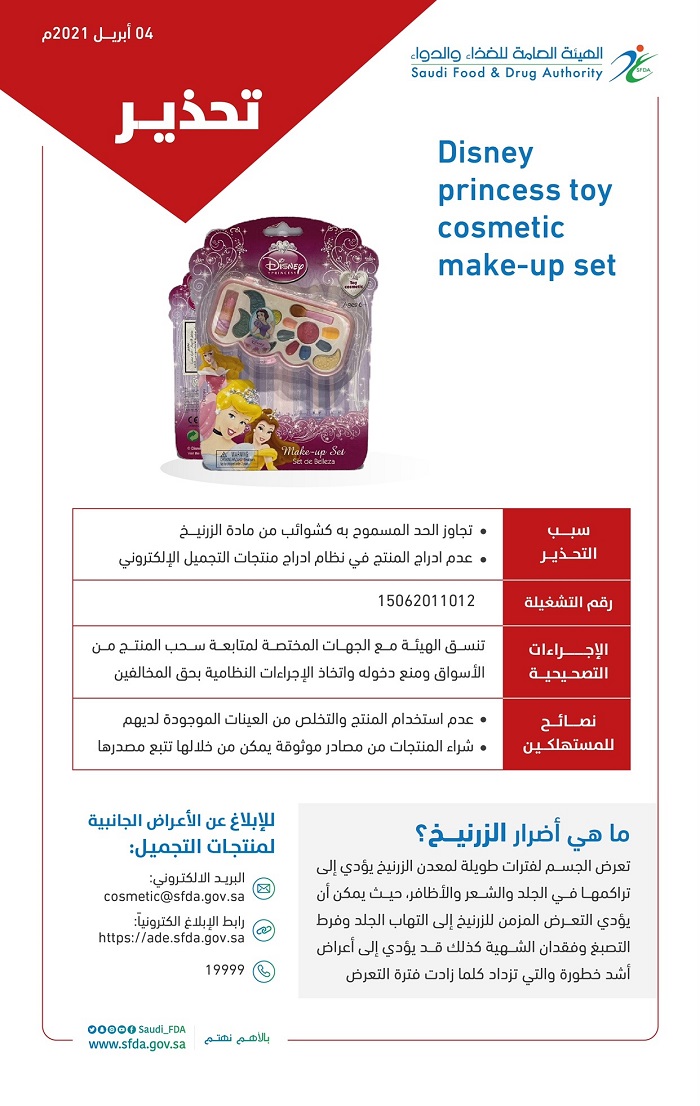 حذرت الهيئة العامة للغذاء والدواء من 12 منتج ألعاب عبارة عن مكياج للأطفال بسبب احتواءها على مادتي "الأنتيمون والزرنيخ" تجاوزت الحد المسموح به كشوائب في لائحة متطلبات السلامة في مستحضرات التجميل والعناية الشخصية رقم SFDA.CO/GSO 1943:2016 ، وعدم ادراج المنتجات في نظام ادراج منتجات التجميل الإلكتروني، مشيرة إلى أن التعرض لنسب عالية من مادتي الأنتيمون والزرنيخ قد يتسبب في مخاطر صحية للمستهلك.