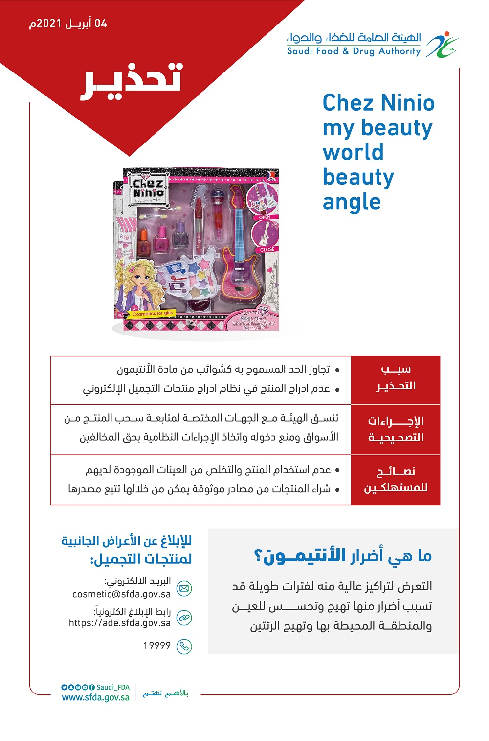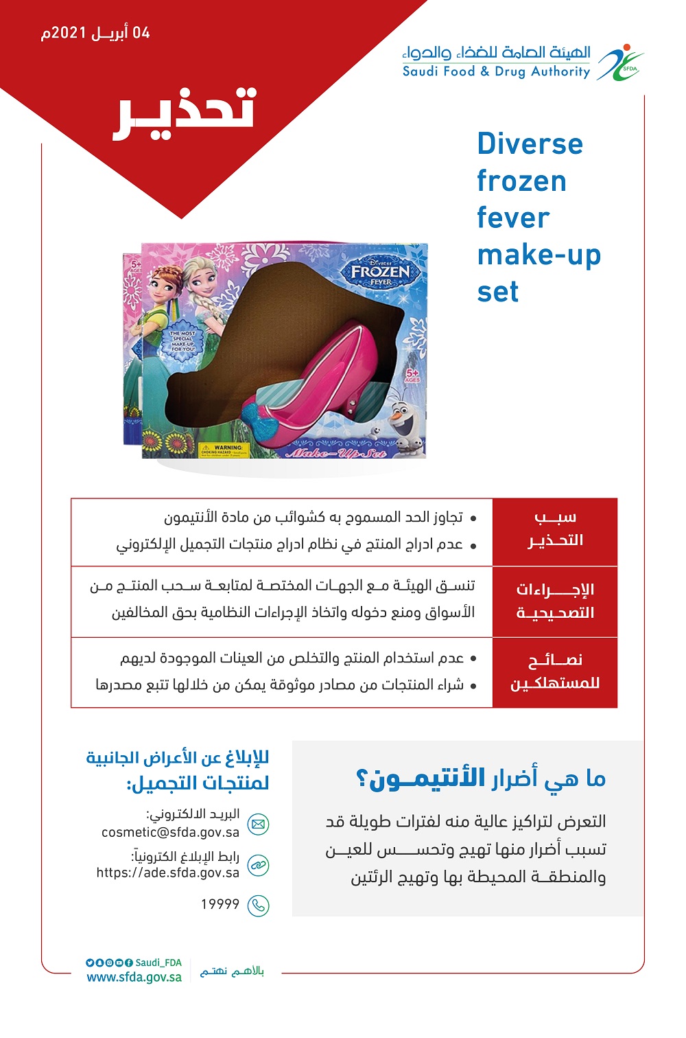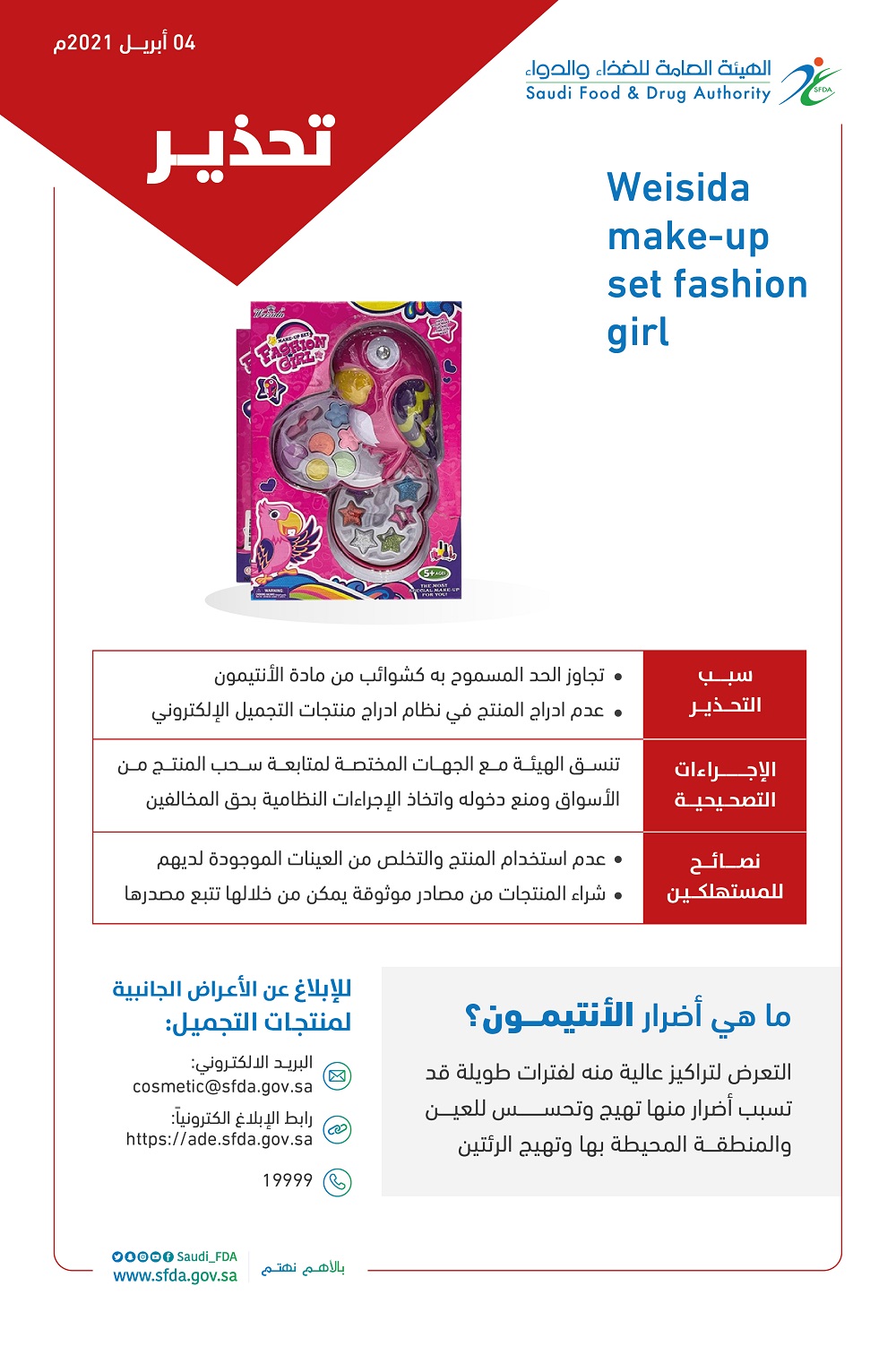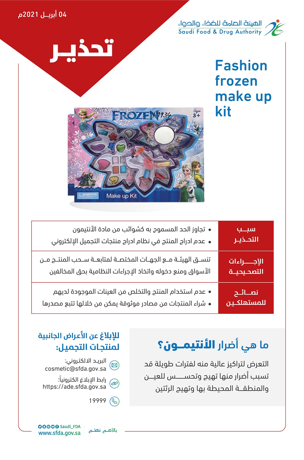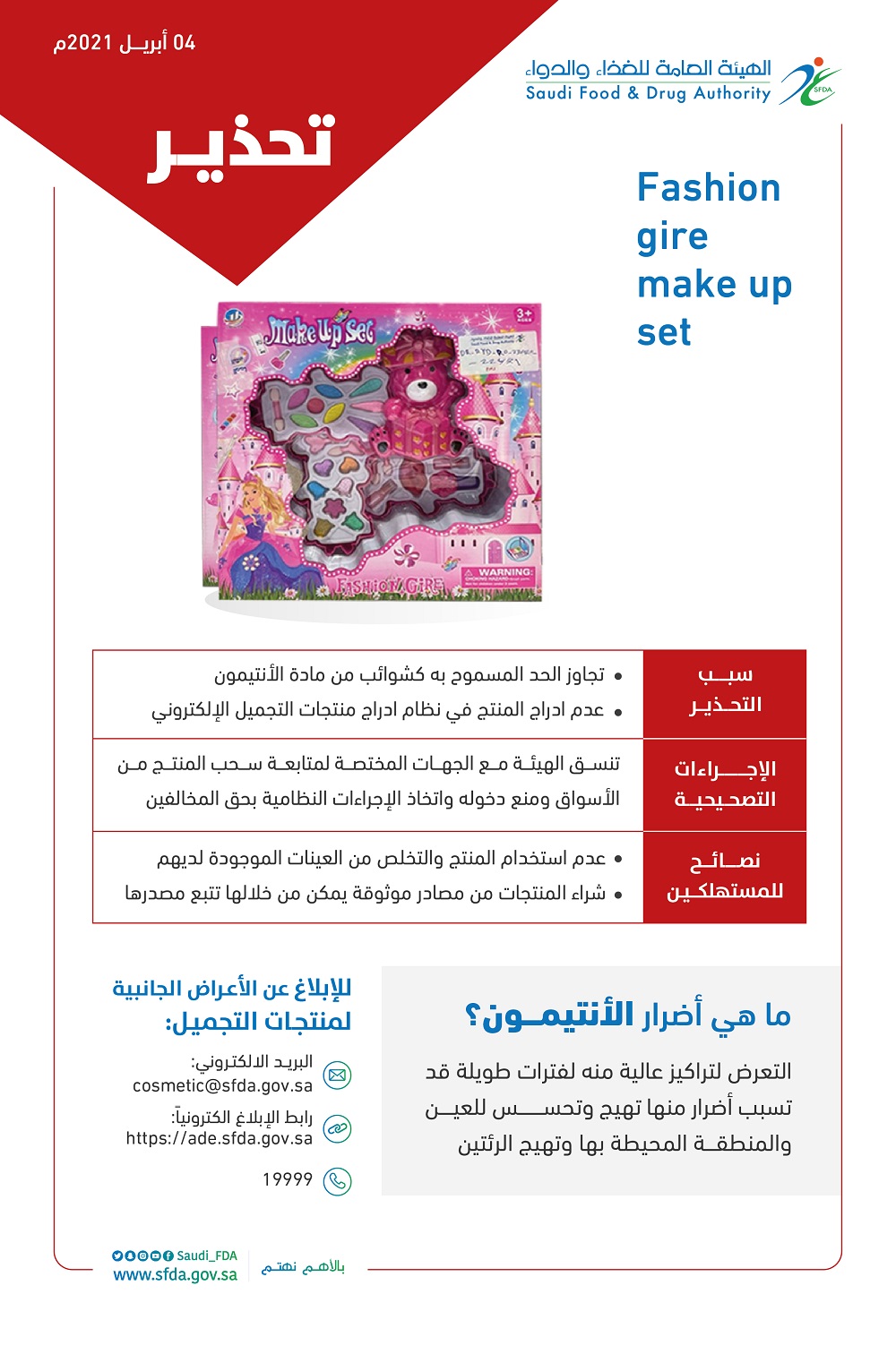 حذرت الهيئة العامة للغذاء والدواء من 12 منتج ألعاب عبارة عن مكياج للأطفال بسبب احتواءها على مادتي "الأنتيمون والزرنيخ" تجاوزت الحد المسموح به كشوائب في لائحة متطلبات السلامة في مستحضرات التجميل والعناية الشخصية رقم SFDA.CO/GSO 1943:2016 ، وعدم ادراج المنتجات في نظام ادراج منتجات التجميل الإلكتروني، مشيرة إلى أن التعرض لنسب عالية من مادتي الأنتيمون والزرنيخ قد يتسبب في مخاطر صحية للمستهلك.