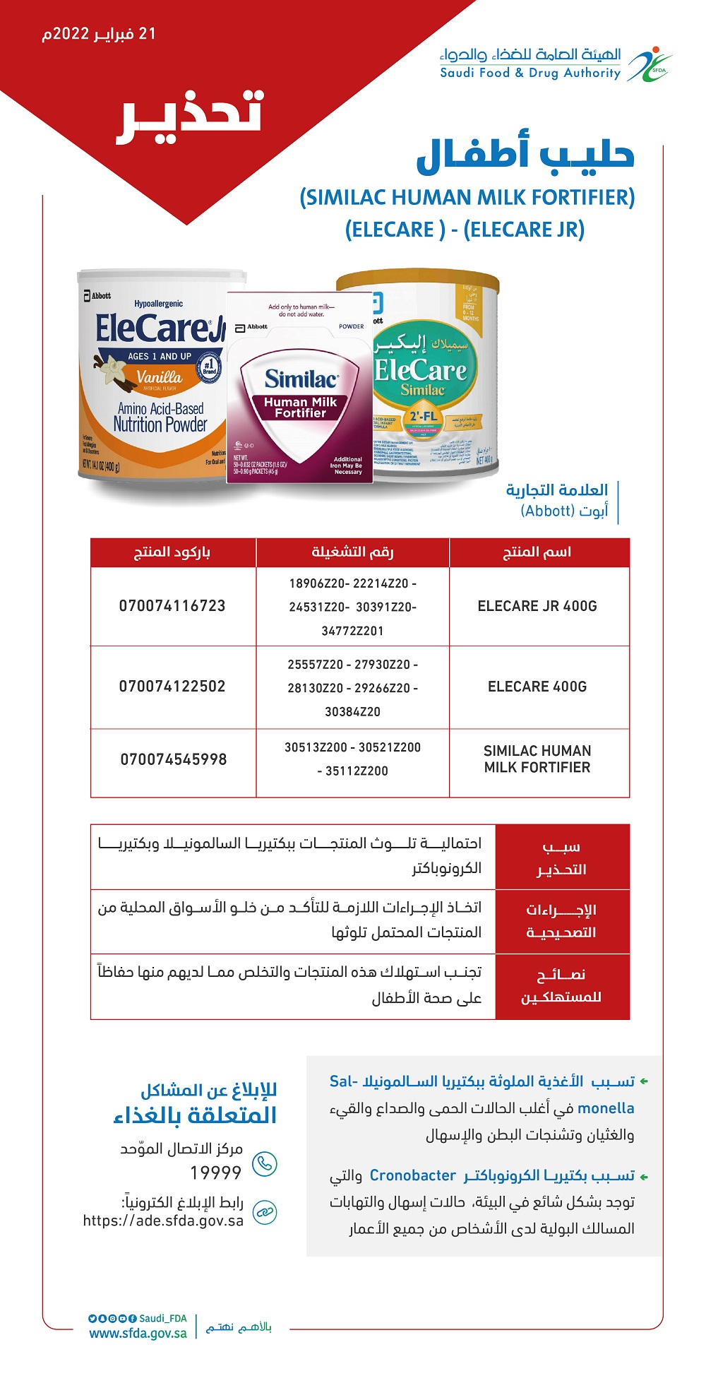 حذرت الهيئة العامة للغذاء والدواء من ثلاثة منتجات بودرة حليب أطفال مجفف من إنتاج أحد المنشآت التابعة لشركة “Abbott” في الولايات المتحدة الأمريكية، وهي (ELECARE JR 400G) و (ELECARE 400G) و (SIMILAC HUMAN MILK FORTIFIER)، وذلك بسبب احتمالية تلوثها ببكتيريا Cronobacter sakazakii وبكتيريا Salmonella Newport .