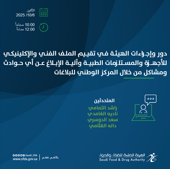 Octoberدور وإجراءات الهيئة في تقييم الملف الفني والإكلينيكي للأجهزة والمستلزمات الطبية و ألية الإبلاغ عن أي حوادث او مشاكل من خلال المركز الوطني للبلاغات