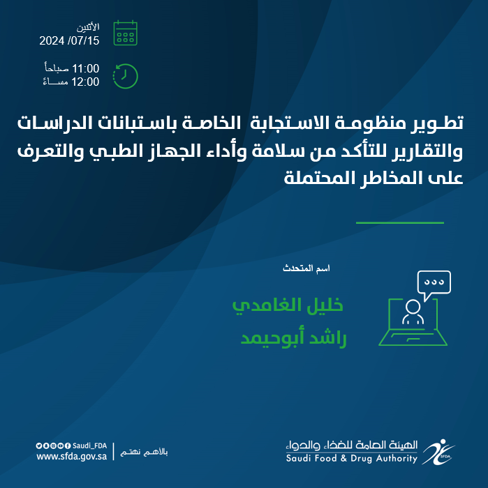 Julyتطوير منظومة الاستجابة الخاصة باستبانات الدراسات والتقارير للتأكد من سلامة وأداء الجهاز الطبي والتعرف على المخاطر المحتملة