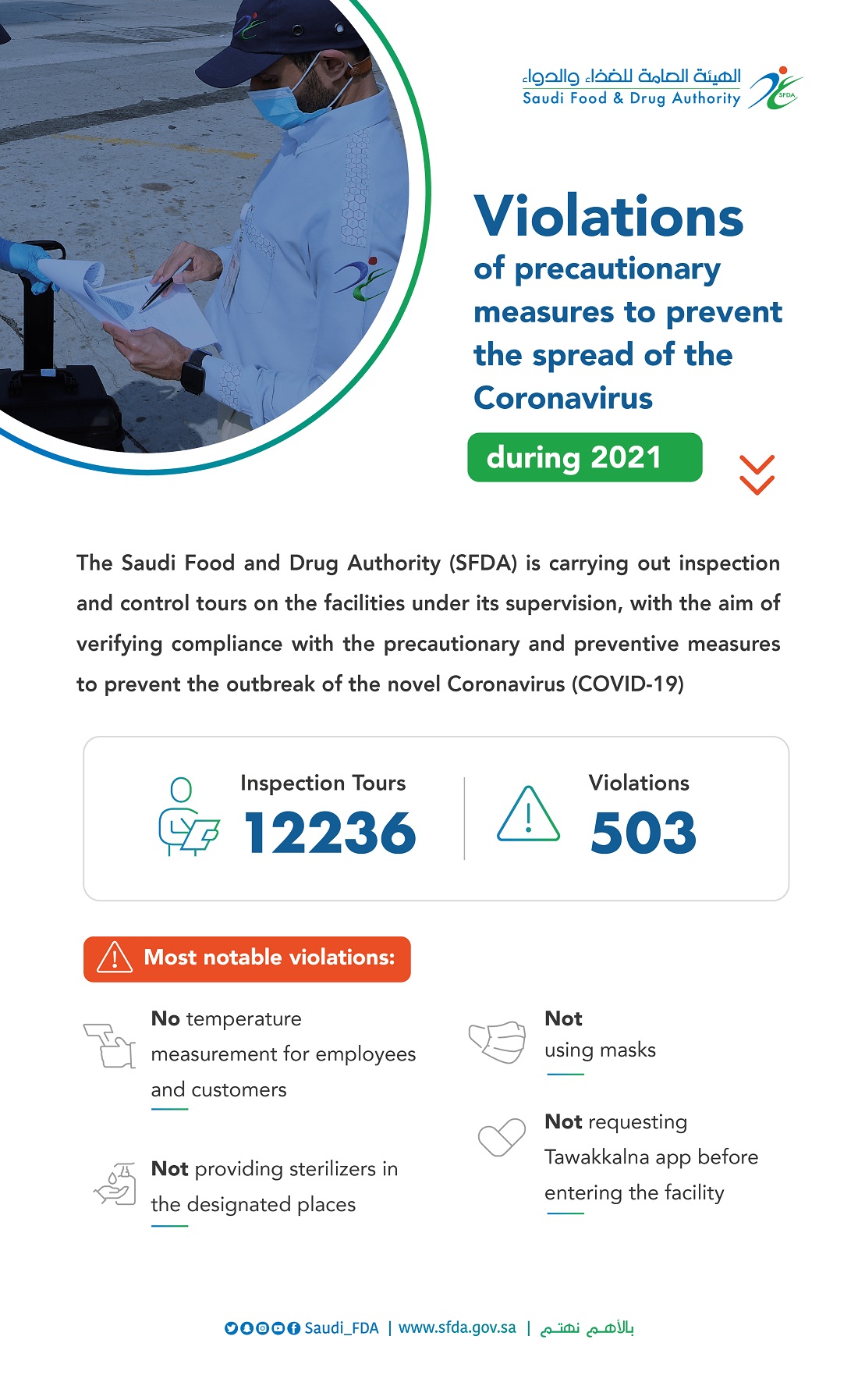 2022-02-14 The Authority SFDA Monitors More than 500 violations in facilities that did not adhere to COVID-19 precautions during 2021 The Saudi Food and Drug Authority (SFDA), during inspection tours in 2021, monitored about 503…