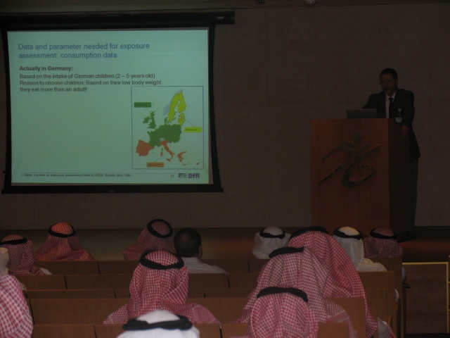 بحضور سعادة نائب معالي الرئيس التنفيذي لشؤون الغذاء أ . د إبراهيم بن سعد المهيزع نظم قطاع الغذاء بالهيئة محاضرة عن " تقييم خطورة التعرض لمتبقيات الملوثات الكيميائية بالأغذية " وذلك يوم الأربعاء 1/12/1430هـ الموافق 18/11/2009م بقاعة المحاضرات الرئيسية بالهيئة ، وقد ألقى المحاضرة الدكتور / لوتز ألدر من المعهد الألماني لتقييم المخاطر حيت تركزت المحاور الرئيسية للمحاضرة على طرق استنتاج الحد الأعلى المصرح به لبعض المتبقيات وتقييم نتائج المراقبة وكذلك اتخاذ القرارات عند زيادة مستوى المتبقيات عن الحدود العليا , وقد ناقش الدكتور/ لوتز الفرق بين الخطورة والمخاطر المحتملة والفصل بين الآثار المزمنة والحادة الناتجة عن التعرض لمستويات مرتفعة من بقايا الملوثات, كما تمت مناقشة أساليب تقييم التعرض لبقايا الملوثات والنماذج الحسابية المستخدمة لتقدير مستوى التعرض لها وتقييم خطورته . وقد شارك بالحضور العديد من ممثلي الدوائر الحكومية و المؤسسات ذات العلاقة ومنسوبي الهيئة العامة للغذاء .