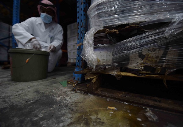 Inspectors also found large quantities of expired materials in a warehouse for the storage of food in Tabuk, as they found more than 2.5 ton (2500 kg) of material showing signs of damage due to poor storage, in addition to the accumulation of food on the floor.