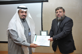 SFDA, represented by the Executive Department of Public Relations and Media, organized a lecture entitled: "Types of Cancer and ways of prevention & treatment "  The lecture was delivered to SFDA employees in collaboration with King Faisal Specialist Hospital and Research Center, represented by Oncology Center. the speech was delivered by Oncology consultant Dr. Adhar Ben Dhia Al Sayed on Monday 10/04/1435 AH.  During the lecture the disease and the reasons for its occurrence was defined, in addition to new methods of cancer examination, the proper ways to prevent and treat it. At the end of meeting, Dr. Al Sayed was honored by the Executive Director of Public Relations and Media, Mr. Mazen Al Ismail with a memorial and a certificate of appreciation.  It is  noteworthy that this lecture comes on the occasion of World Cancer Day for the year 2014 held in February every year.