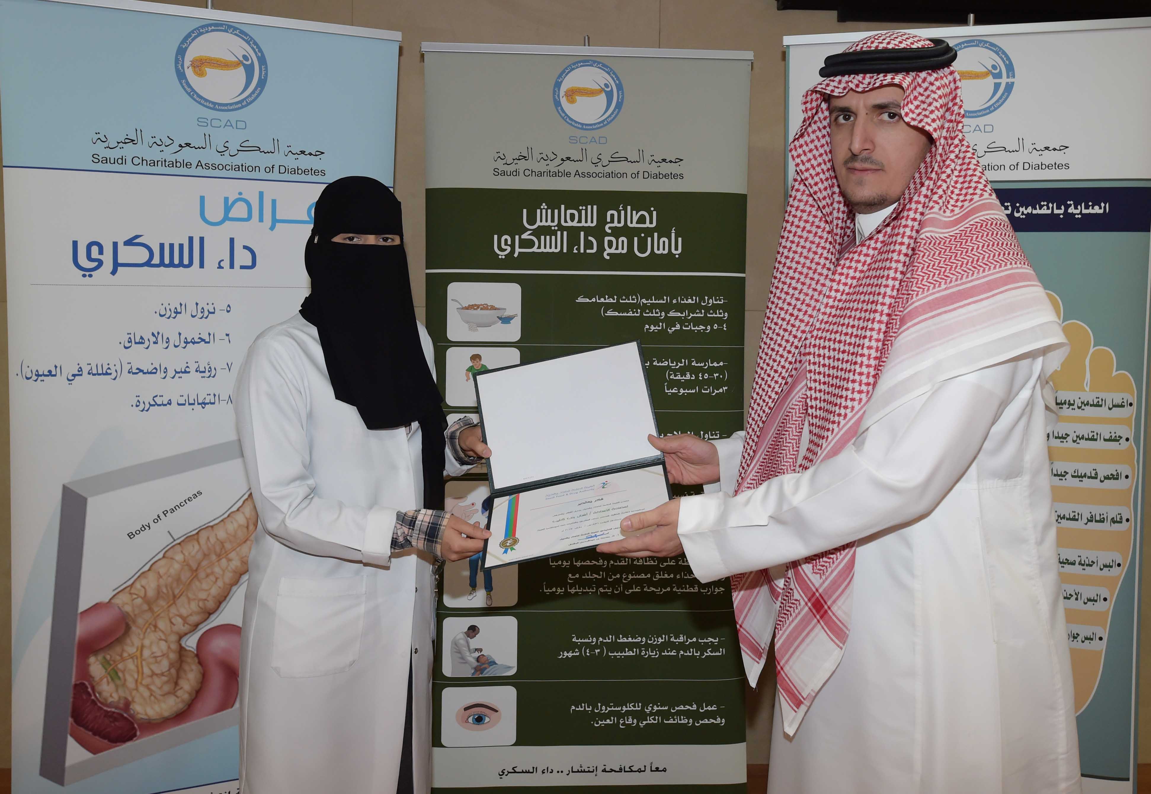 وفي نهاية الفعالية، كرمت الهيئة المشاركين من جمعية السكري السعودية الخيرية، وقدمت شهادات شكر لمسؤولة التثقيف في الجمعة حبيبة أوشك، واختصاصية التغذية أفنان بنت كليب، والمثقف الصحي أحمد حرحش.