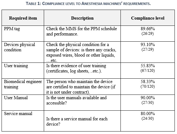 Table 1 shows the compliance-level of Saudi healthcare faculties. The results indicate a non-compliance of 10% to the PPM procedures within all sample of healthcare facilities. Also, it was found that there is 7% non-compliance to the devices physical condition within the anesthesia. However, a high level of non-compliance with the safe use of anesthesia results in 44% for the user training and 42% for the biomedical engineer training. Not only that, but the same case is also concluded for the availability of user and service manuals by non-compliance percentages of 10% and 20%.