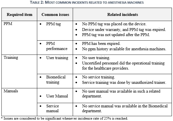 This section aims to sum up the previous statistics to indicate the most and least common issues of SHCF that are in non-compliance with SFDA requirements for critical medical device. Table 2 indicates that the most common issues of anesthesia are related to PPM, Training and manual. PPM activity shall be performed properly in reference to manufacturer recommendations to ensure the ideal life span, well-functioning, and safety of healthcare providers and patients. Upon that, acquiring deficiencies through PPM performance or in ppm tag with a frequency of 27% will impair the healthcare facility in total. Technical and operational pieces of training present a prime opportunity to expand the knowledge base of healthcare providers in operating and utilizing the anesthesia machine. Nonetheless, the anesthesia machine is not like any other tool, it is a life support machine that will perform well when operators know how to use it properly. Consequently, any technical or user training neglect with 40% and 33% occurrence repetition will elevate the risk of adverse events and recalls. The role of service and user manuals with medical devices is to comprehend how the anesthesia works technically and clinically. Not only that, but having also written manuals will ease the route to obtain information, transfer knowledge, and self-learning. Thus, having a shortage of manuals in the healthcare facilities would point out the lack of knowledge in implementing the clinical and technical practices into and from the medical devices, and recurring this issue by 30% for user manual and 40% for service manual will increase it.