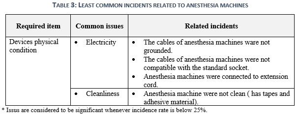 The devices physical condition of the anesthesia machine is the main interface of the healthcare facility to represent the quality provided to patients. It will also mirror the overall image of how the safety of critical medical devices is being performed in their hospitals. Hence, the re-existence by 13% of residue bio-fluids and improper electricity will not only reflect improper quality, but they will also impact negatively on healthcare provider’s life in first followed by patient’s life table 3.
