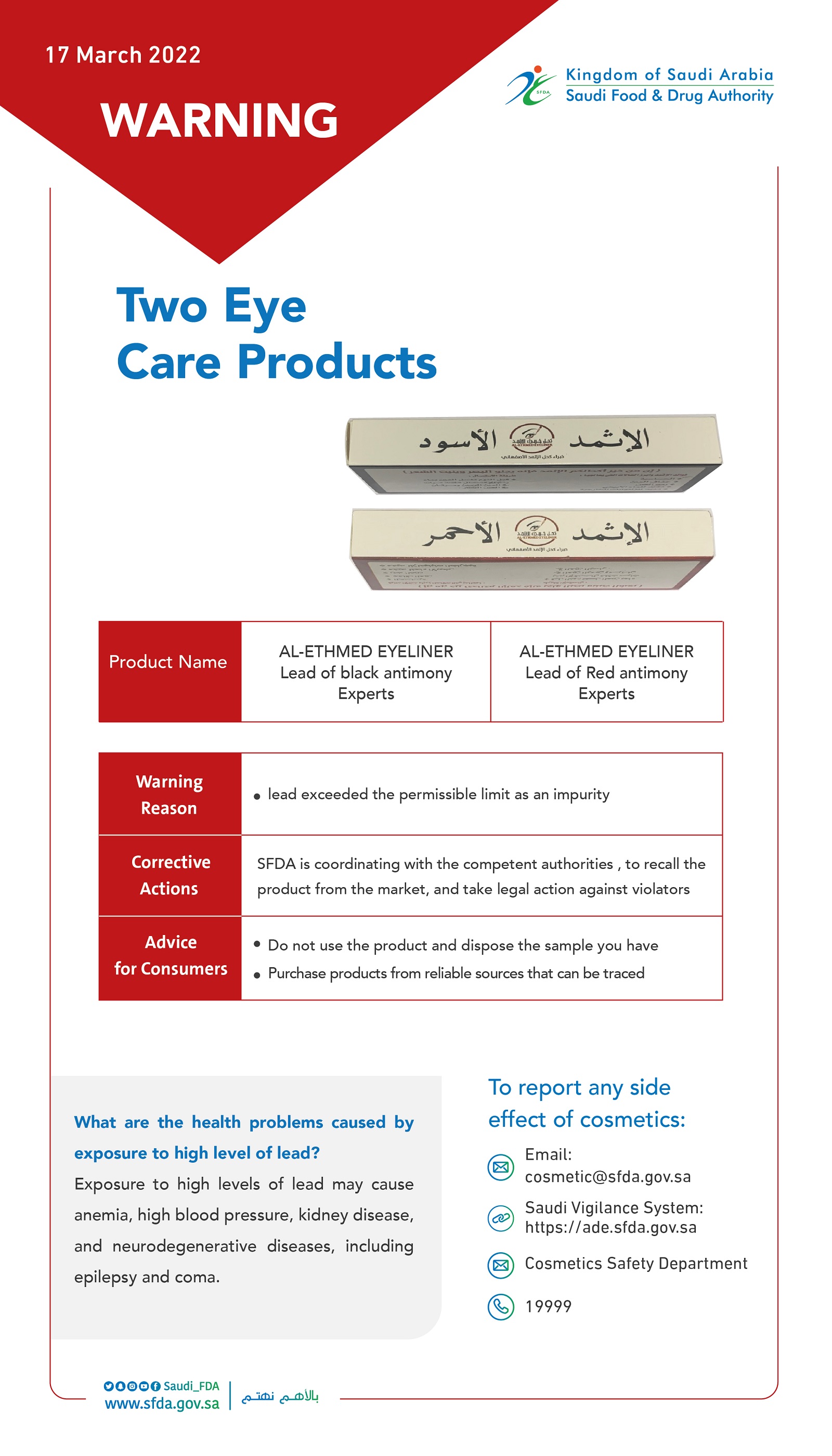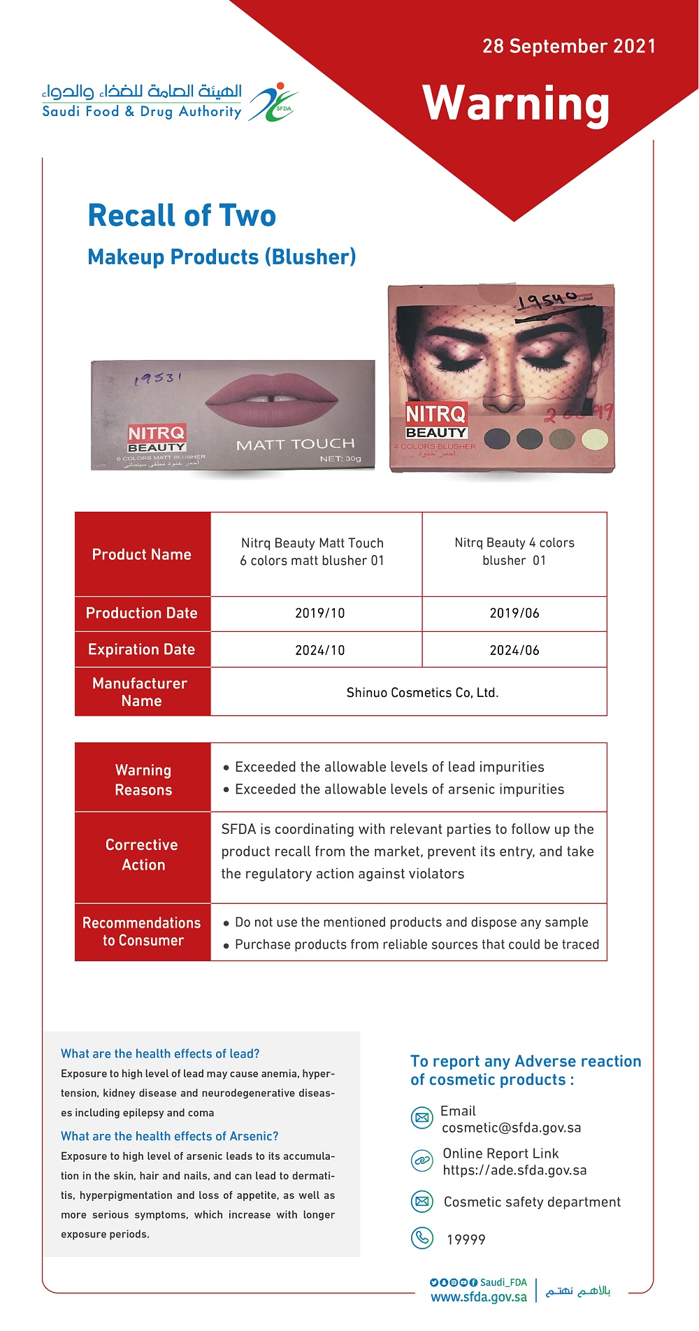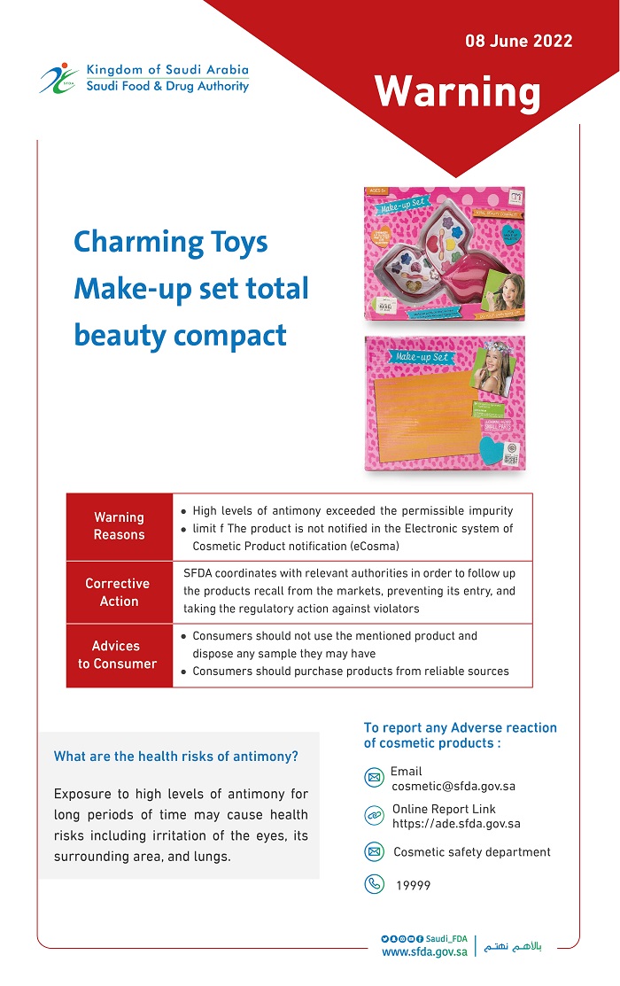 The Saudi Food & Drug Authority (SFDA) issued a warning against a makeup toy kit due to containing high level of “antimony”, which exceeded the permissible limit as an impurity according to the safety requirements of cosmetics and personal care products regulations NO. SFDA.CO/GSO 1943, as well as the product is not notified in the Electronic System of Cosmetic Product notification (eCosma).