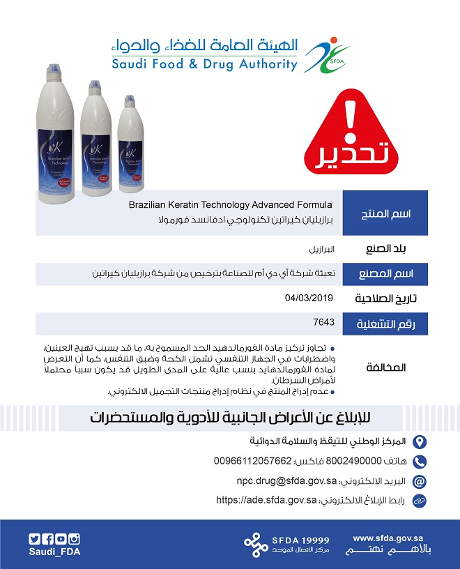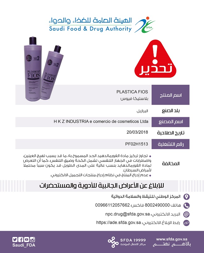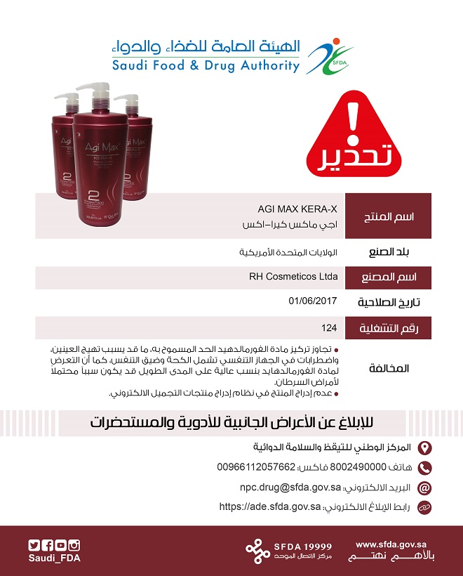 . SFDA added that the results of these analysis revealed that five of these products contain high percentage of Formaldehyde which is considered dingoes if exceeded 0.2% ( The permissible concentration by GSO 1943/2009) lading to eye irritation, respiratory system disorder-including cough & breathing difficulty- and may cause cancer on the long run.